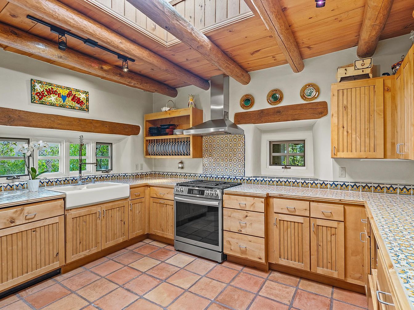This kitchen combines rustic charm and modern functionality. Exposed wooden beams create an inviting atmosphere, while the terracotta tile flooring adds warmth. The cabinetry features natural wood, showcasing a handcrafted look. A large farmhouse sink sits under a window, allowing natural light to illuminate the space. Colorful patterned tiles line the countertop, adding an artistic flair, and matching tiles border the walls. Open shelving displays dishes, enhancing accessibility and decor. A stainless-steel oven contrasts with the wood, blending contemporary appliances into the warm aesthetic. Brightly colored wall art provides a personal touch, emphasizing the home’s unique character.