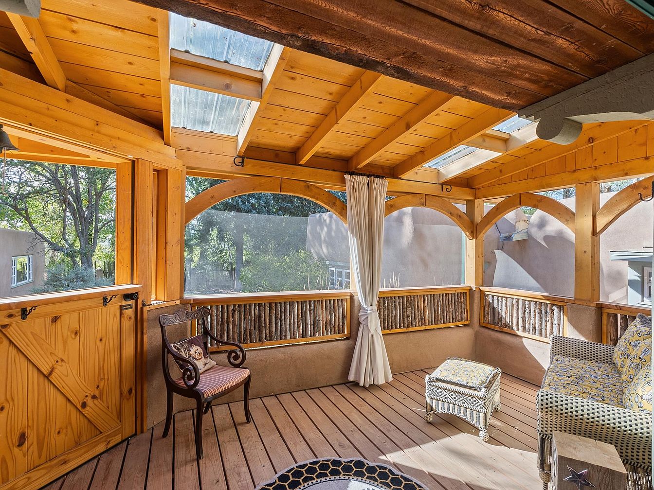 This inviting sunroom features warm wooden beams and a slatted ceiling, creating a cozy atmosphere. The walls are adorned with large windows, allowing natural light to flood the space and providing views of the surrounding greenery. A rustic wooden door and a charming chair add character, while a patterned sofa and ottoman enhance comfort. The warm tones of natural wood and soft furnishings harmonize to create a tranquil retreat. The flooring showcases rich wooden planks, complementing the overall aesthetic. Draped fabric softens the look, and the decorative elements reflect a blend of casual elegance and rustic charm.
