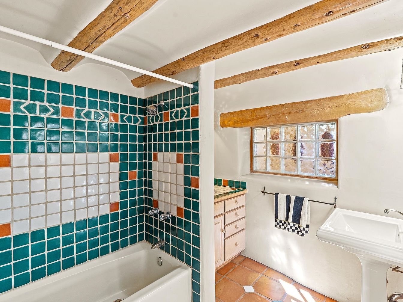 This bathroom features vibrant, textured turquoise and white tiled walls, with small orange accents creating a lively atmosphere. A simple bathtub sits beneath the intricate tile work, while a freestanding sink boasts elegant curves. Exposed wooden beams add rustic charm, contrasting against smooth plaster walls. Natural light filters through a glass block window, enhancing the warmth of terracotta floor tiles. A towel rack displays striped towels, contributing to the cozy, inviting feel. The cabinetry, crafted in a soft pink hue, complements the overall color palette, uniting functionality with an artisanal aesthetic in this intimate space.