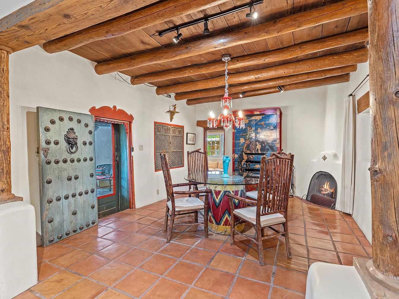 This dining room features a rustic yet artistic design with exposed wooden beams overhead. The tan and terracotta tiled floor contrasts with the white stucco walls, enhancing the warm atmosphere. Central to the room is a round glass table supported by a colorful, tribal-patterned pedestal. Surrounding the table are wooden chairs, each adorned with white cushions for comfort. An ornate chandelier with red accents hangs above, adding a touch of elegance. To one side, a striking blue door with a decorative knocker leads outside, while a corner fireplace with a minimalistic design provides warmth, contributing to the inviting ambiance.