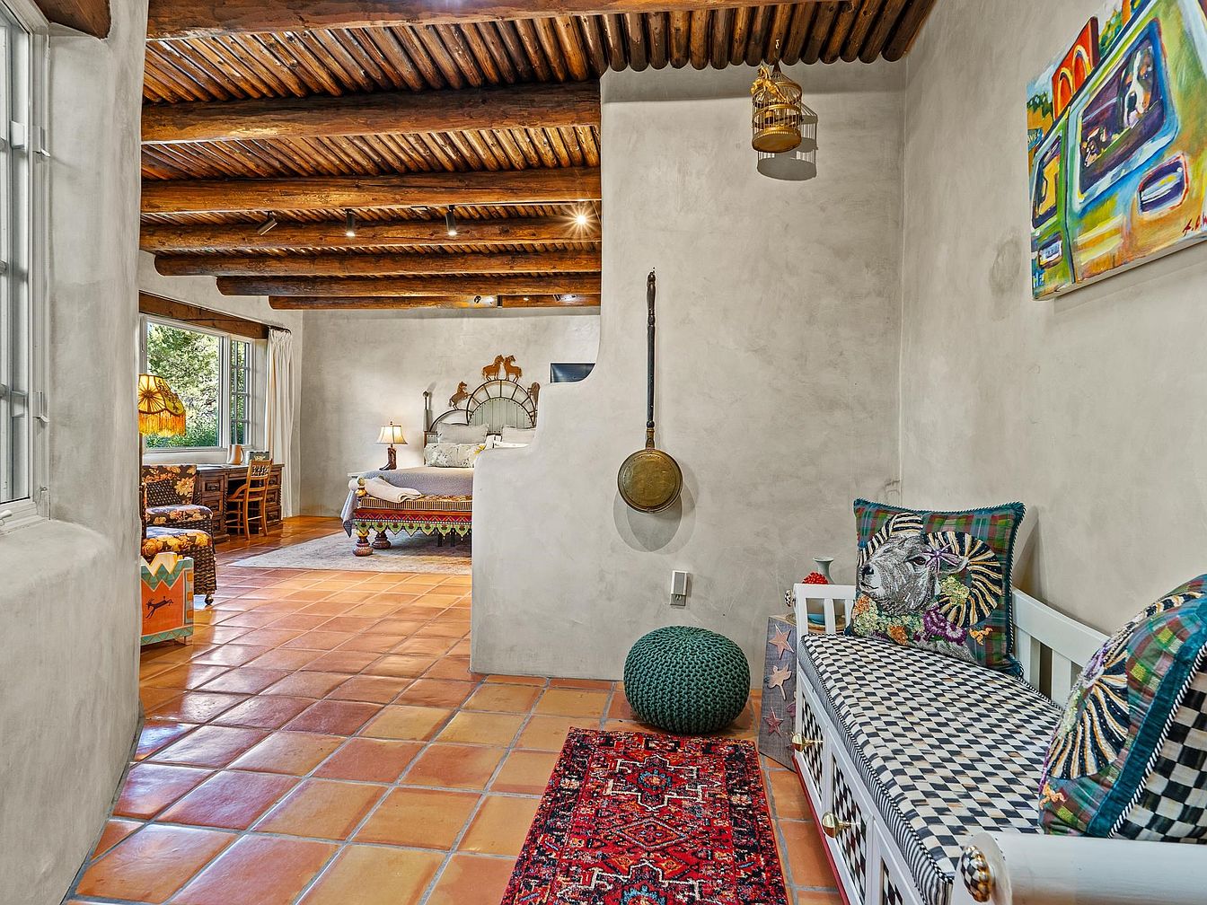 A cozy bedroom featuring a mix of rustic and eclectic elements. Exposed wooden beams crisscross the ceiling, complemented by smooth plaster walls in a soft neutral hue. A large window allows natural light to flood the space, framed by white drapes. The bed boasts a unique headboard adorned with horse motifs, flanked by charming bedside lamps. A colorful, intricately designed bench sits at the foot of the bed. Textured rugs warm the terracotta tile floor, while floral-patterned seating nearby adds comfort. Decorative art pieces and a small fireplace enhance the inviting atmosphere, blending traditional and contemporary aesthetics.