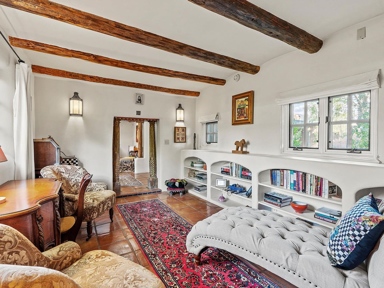 This living room showcases earthy tones with textured walls and exposed wooden beams. Rich terracotta tiles cover the floor, harmonizing with the soft cream walls. A vintage-inspired area rug with intricate patterns adds warmth. Elegant, upholstered armchairs in damask fabric flank a classic wooden writing desk, while unique light fixtures grant a cozy ambiance. A built-in bookshelf, curved and smooth, highlights a collection of books and decorative items, enriching the charming aesthetic. A colorful throw pillow adorns a tufted chaise that invites relaxation, while natural light filters through the double-hung windows, enhancing the welcoming atmosphere.