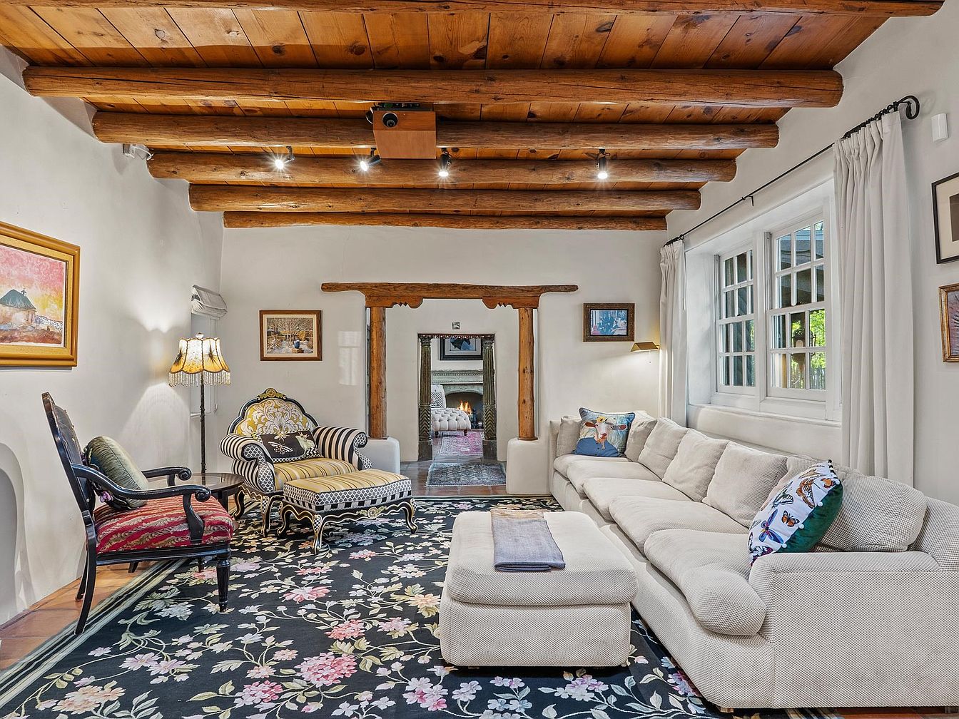 This living room embodies a blend of rustic charm and elegant decor. Exposed wooden beams create a warm atmosphere, while a plush light gray sectional couch offers comfort. A floral-patterned area rug gently contrasts against hardwood floors, adding a touch of vibrancy. Tasteful artwork adorns the walls, with a gold-framed piece and cozy lighting from a vintage-style lamp enhancing the ambiance. An ornate accent chair in black and white adds a striking focal point. Soft, white drapes frame large windows, allowing natural light to illuminate the space, accentuating its welcoming and sophisticated design.