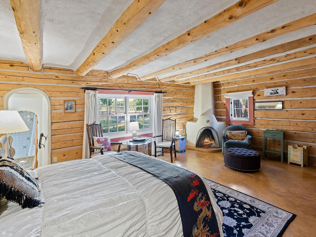This cozy bedroom showcases natural wood beams framed by a rustic log wall, creating a warm, inviting atmosphere. A plush white quilt adorns the bed, contrasting elegantly with dark decorative pillows. To the side, a petite circular stool with tufting complements a cozy armchair near a charming fireplace, which adds ambiance. Large windows allow natural light to flood the space, framed by soft drapes, offering views of the vibrant outdoor landscape. A vintage green side table and decorative accents enhance the room’s character, while the earthy tones of the wood and floor contribute to an overall tranquil aesthetic.