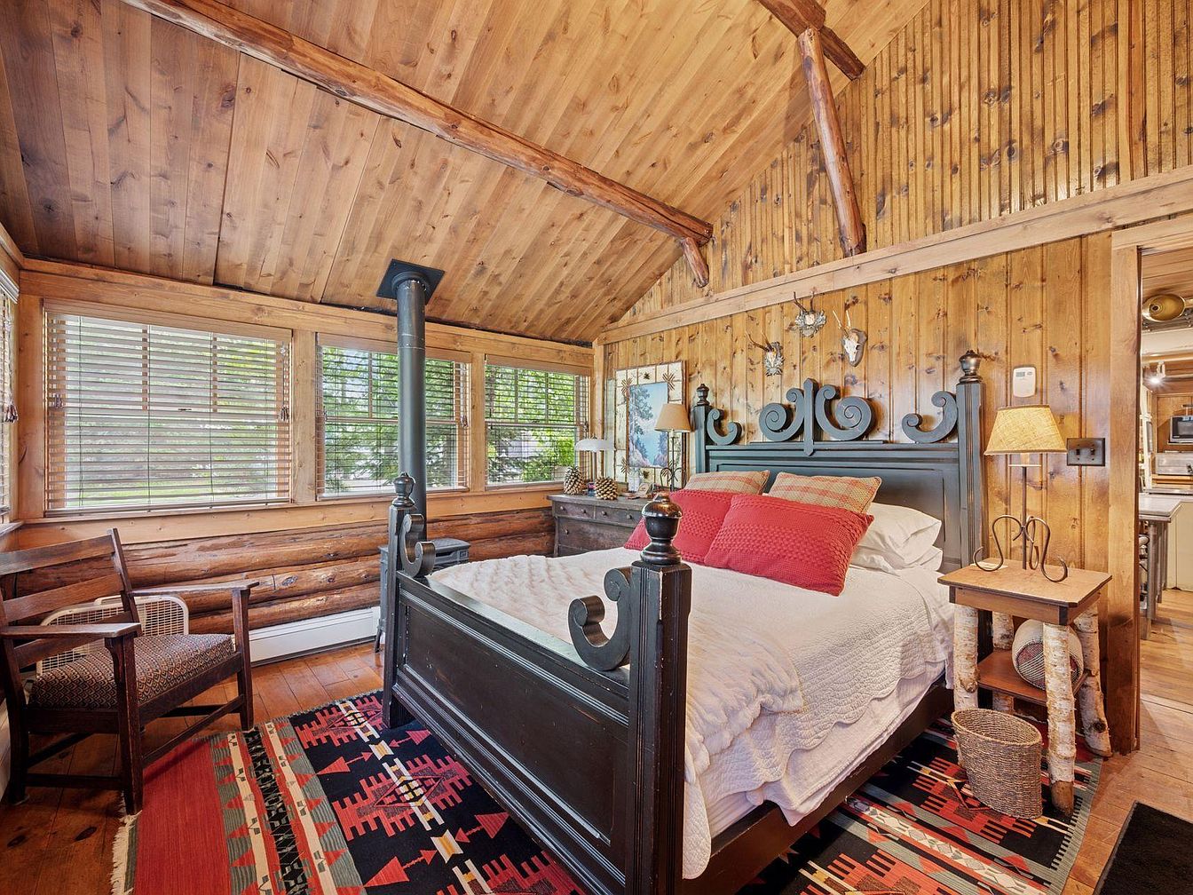 This cozy bedroom features a traditional design with rich wood accents throughout. The walls and ceiling are adorned with warm wood paneling, complemented by exposed beams. A large black wooden bed with an ornate headboard is the focal point, dressed in crisp white linens and decorative red pillows. A woven area rug with vibrant geometric patterns adds warmth and color to the hardwood floor. Adjacent to the bed, a rustic side table made of logs holds a small lamp and a basket. Ample natural light floods the room through window blinds, enhancing the inviting atmosphere.