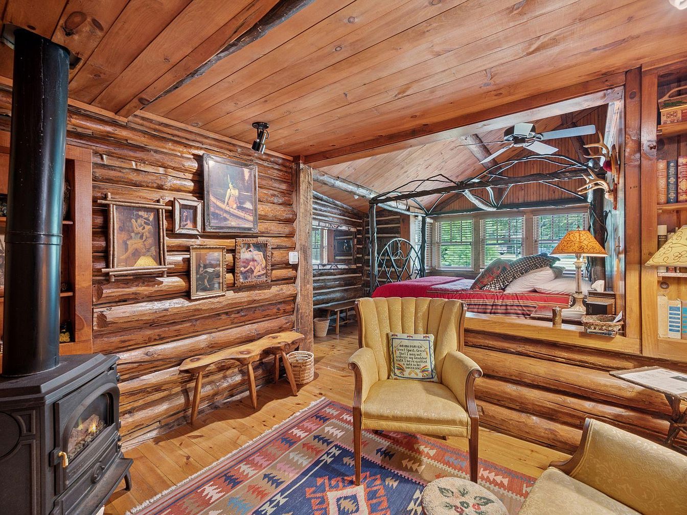 A rustic interior showcases exposed wooden beams and log walls, evoking a warm, inviting atmosphere. The carefully arranged seating includes a vintage armchair with soft, yellow upholstery and a patterned rug beneath, adding texture. Nearby, an ornate wood stove offers both function and aesthetic, enhancing the cozy feel. Framed artwork hung above a natural wood bench displays local artistry, adding character to the space. The light filtering through the window highlights a unique bed frame with twig-like design elements, blending with nature. Overall, the earthy color palette and eclectic decor create a harmonious blend of comfort and charm.