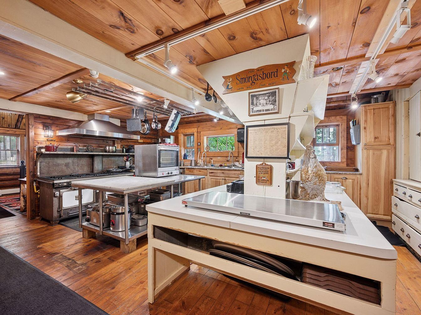 A spacious kitchen with rustic charm, showcasing warm wood tones in both the ceiling and flooring. The layout features an island countertop at the center, surrounded by stainless steel appliances, including a range and oven. Wooden cabinetry complements the natural aesthetic, accented with various kitchen tools hanging above. Natural light floods the room through multiple windows, highlighting the unique blend of vintage and modern elements. Decorative items, such as a rooster statue, add personality, while a soft area rug ties the space together. Overall, the kitchen exudes a welcoming and functional farmhouse vibe.