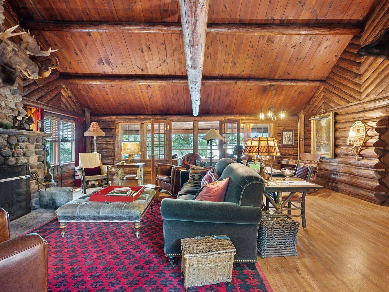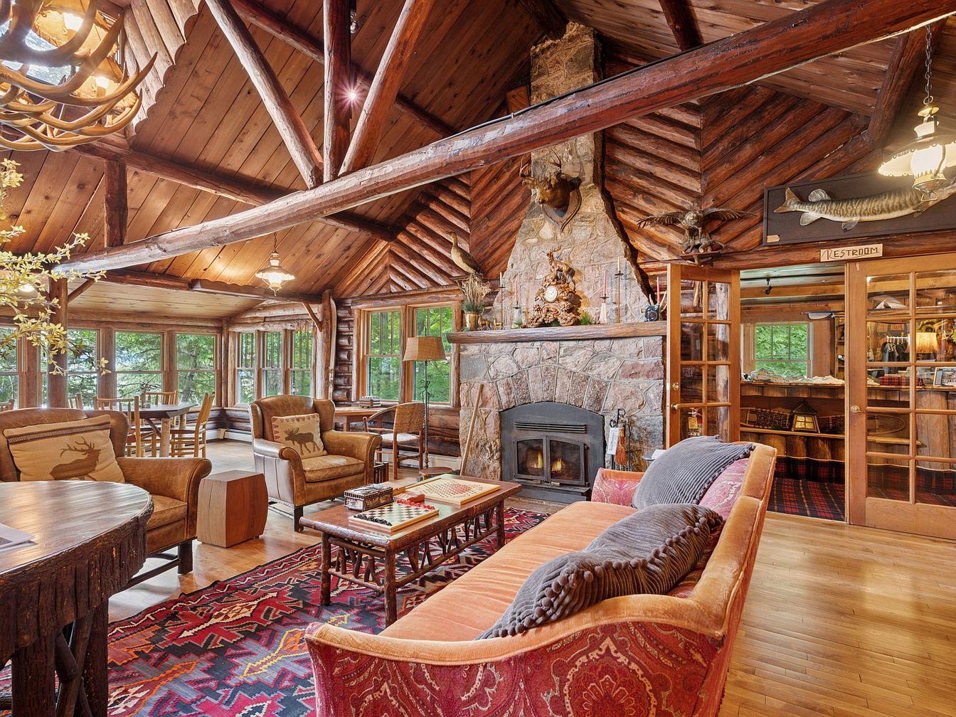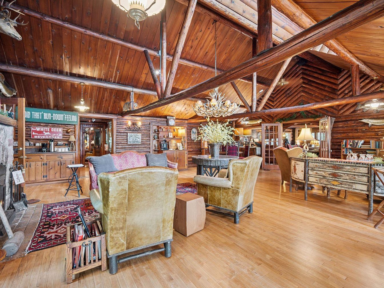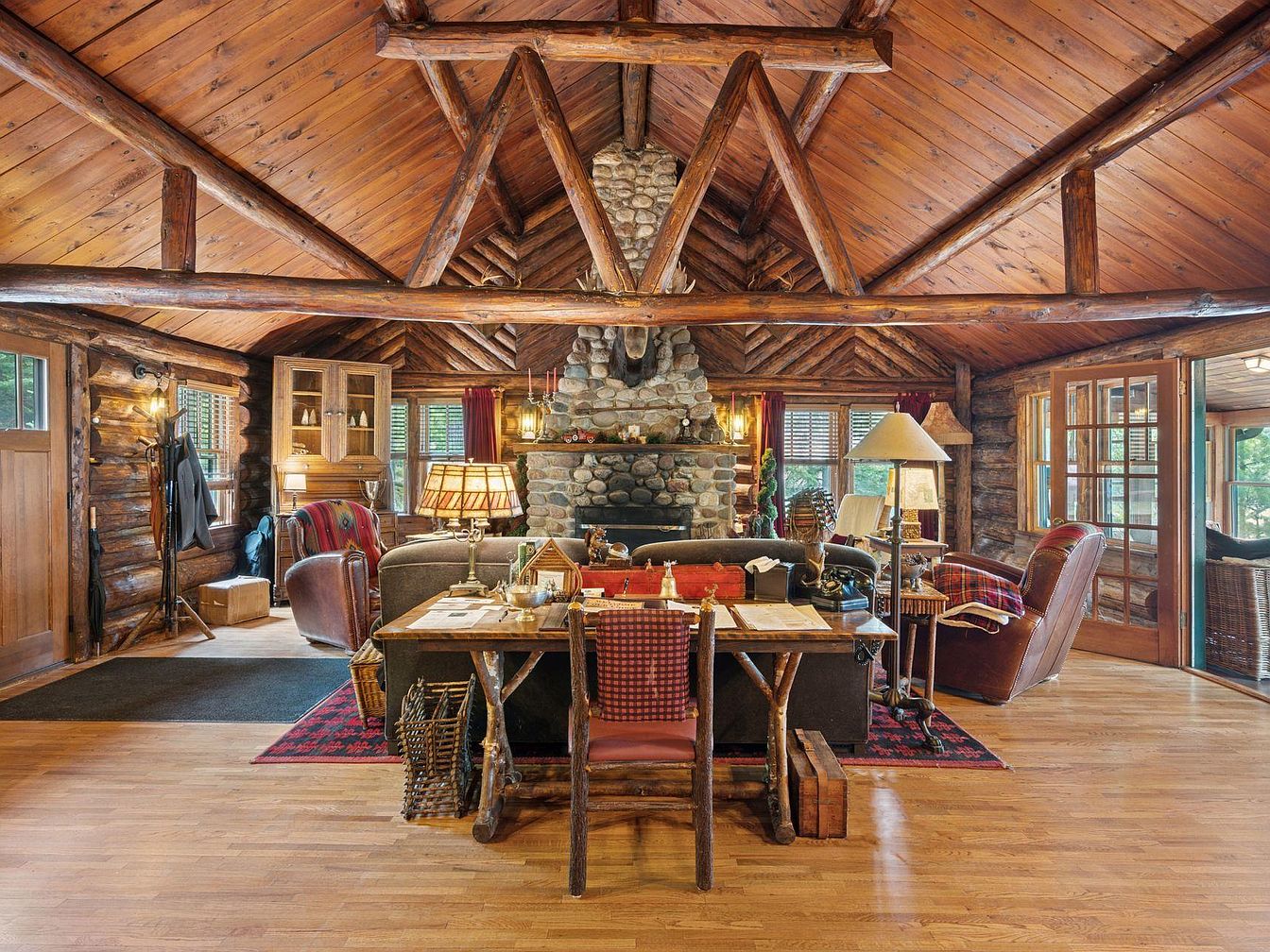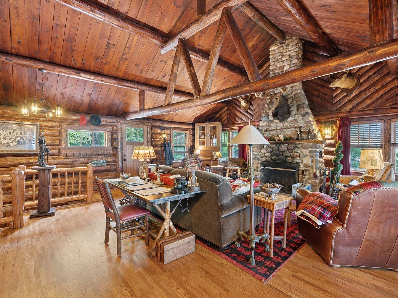 A rustic living room exuding warmth with its log cabin structure and a dramatic wood-beamed ceiling. The focal point is a large stone fireplace, framed by decorative taxidermy and ornate accents, creating a cozy ambiance. Natural light floods in through large windows, reflecting off the polished wood floor. The seating arrangement features a plush, floral-patterned couch and a leather armchair, inviting comfort. Accents include a vibrant area rug with tribal patterns and a vintage-style lamp, while a dining table nearby showcases a natural wood finish, harmonizing with the earthy tones throughout the space.