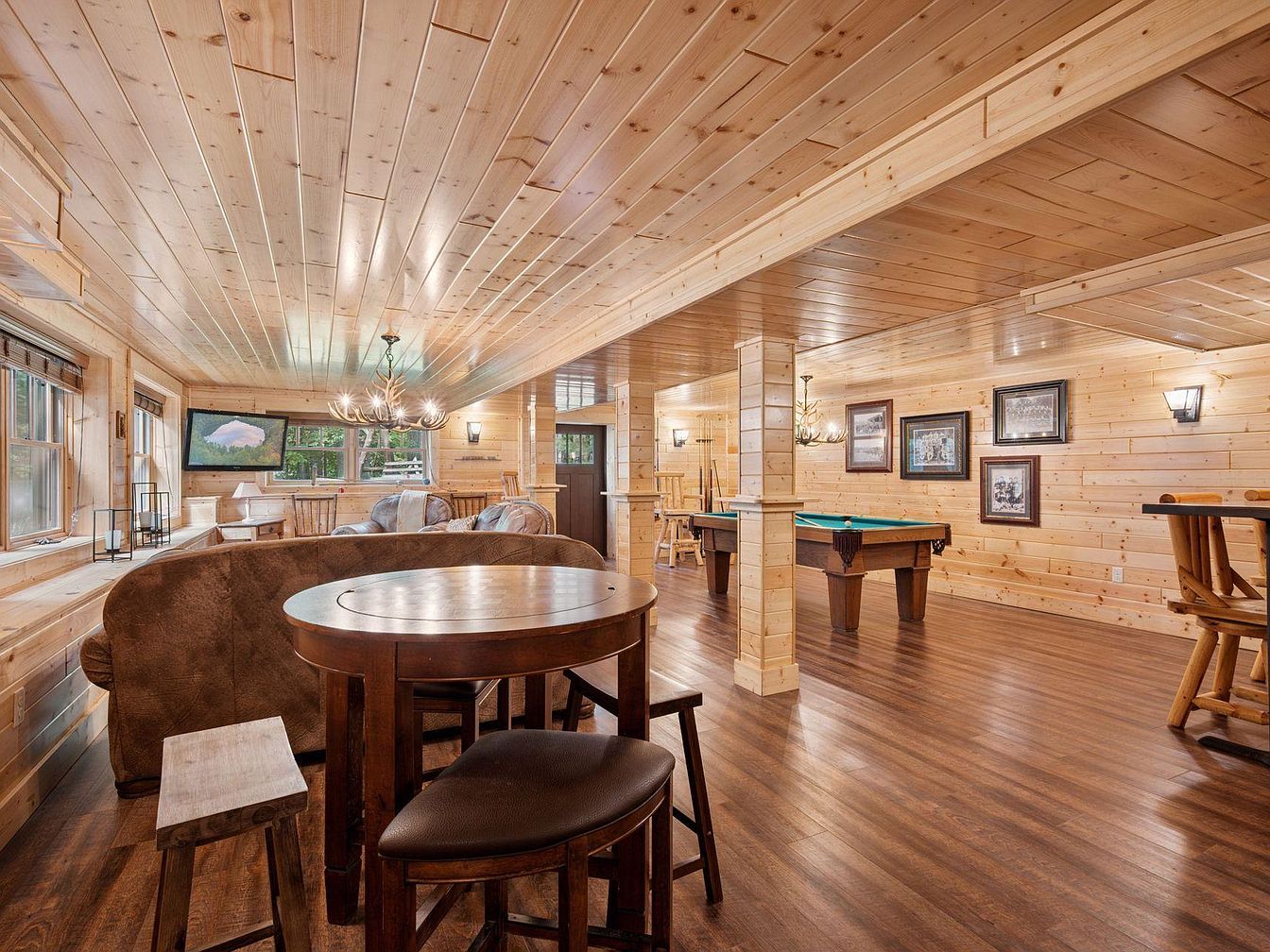 This spacious game room features warm wooden paneling and ceiling, creating a cozy cabin-like atmosphere. The room is illuminated by a combination of natural light and wall-mounted lanterns, enhancing its inviting feel. A circular wooden table with dark finish complements the seating arrangement, including plush leather sofas and bar stools around the pool table. The flooring showcases rich brown tones, while the walls are adorned with framed artwork, adding character. Large windows provide views of the outdoors, inviting a sense of tranquility into the space. This room seamlessly blends functionality and comfort for leisure activities.