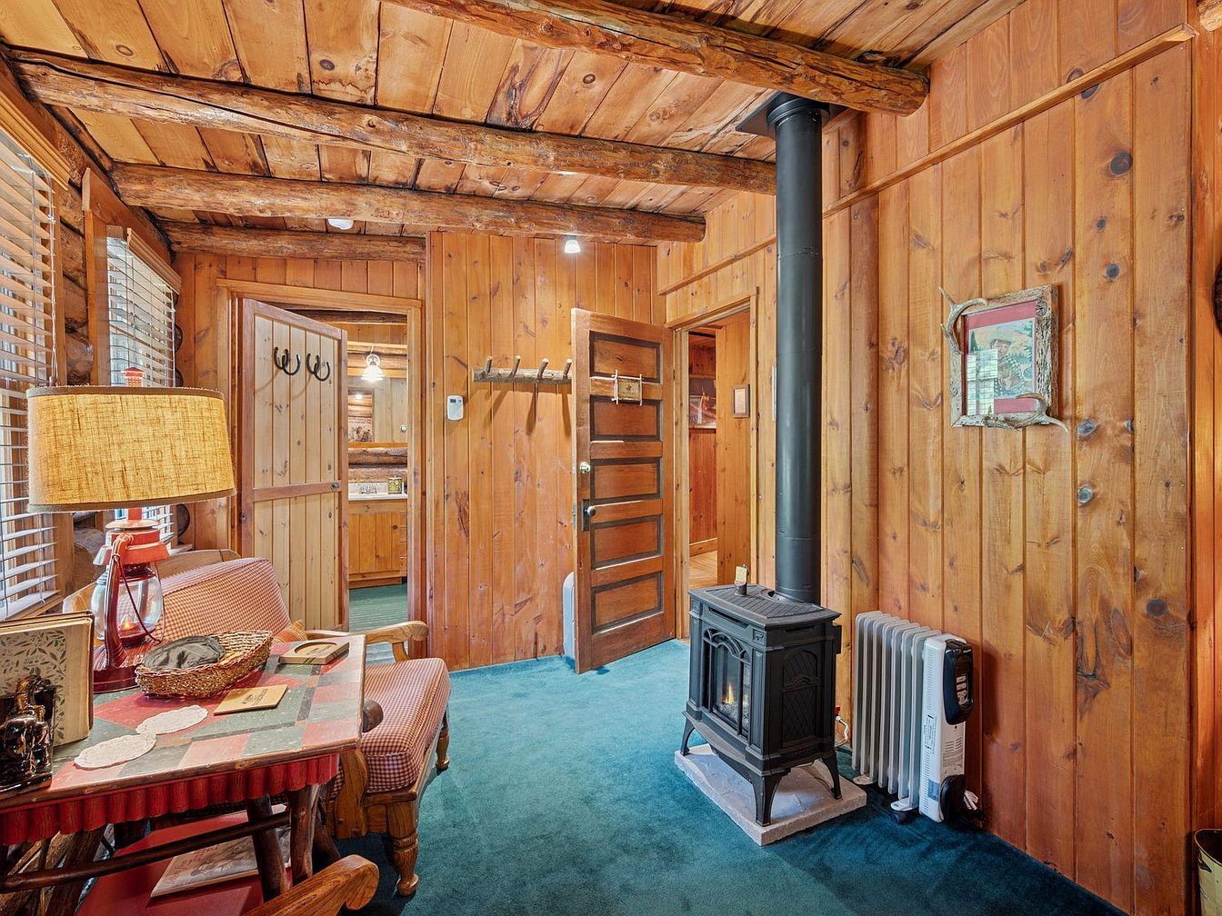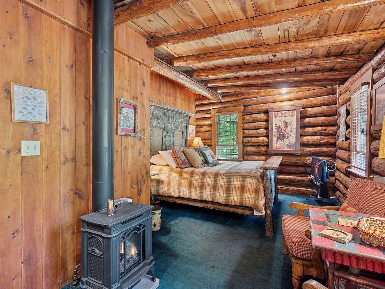 This rustic bedroom features walls made of warm-toned log wood, creating a cozy, inviting atmosphere. The floor is carpeted in deep blue, contrasting beautifully with the wood. Centered is a sturdy wooden bed adorned with a plaid comforter, enhancing the cabin vibe. A vintage-style metal stove stands beside the bed, radiating warmth. To one side, a matching wooden chair and table, both with charming checkered patterns, offers a quaint seating area. Light filters through wooden blinds, adding a soft glow, while framed artworks and a wall-mounted decorative piece contribute to the historic charm of the space.