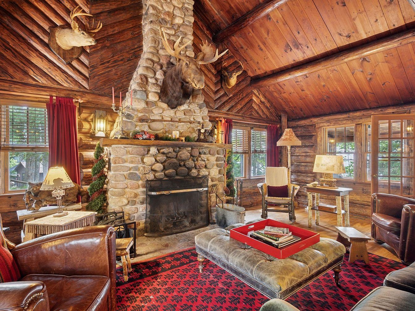 A cozy living room with rustic charm features exposed log walls and a vaulted wood ceiling, enhancing the warmth of the space. The centerpiece is a large stone fireplace adorned with taxidermy, surrounded by comfortable seating, including leather and upholstered chairs. Dark red accents, such as plush cushions and curtains, contrast with the warm wooden tones. A wooden table, decorated with vintage artifacts, occupies a central position, inviting gatherings. Ambient lighting from stylish lamps adds a soft glow, while large windows allow natural light to brighten the room, linking the interior with the scenic outdoor landscape.
