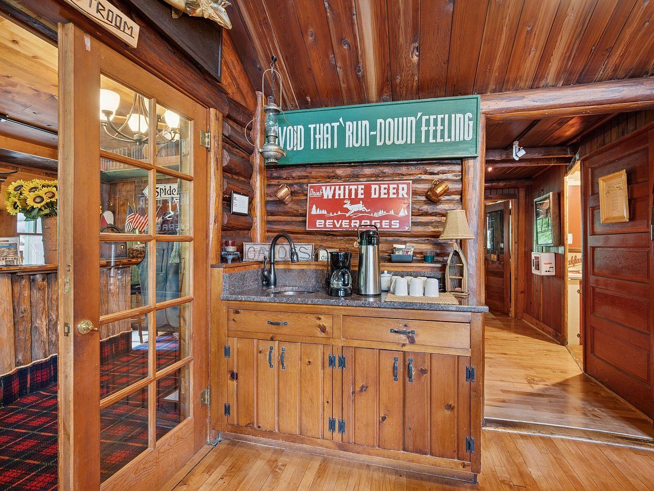 This kitchen area features rustic log walls and a wooden ceiling that creates a warm, inviting atmosphere. A stone countertop is used for food prep, paired with a modern black faucet, positioned above matching cabinetry. The natural wood hues are complemented by a red and black plaid rug, enhancing the cozy aesthetic. Charming vintage signs adorn the walls, infusing the space with character and history. Sunflowers in a basket add a touch of color, while glass-paned doors lead to other areas, allowing natural light to flow. The overall design balances modern convenience with traditional charm.