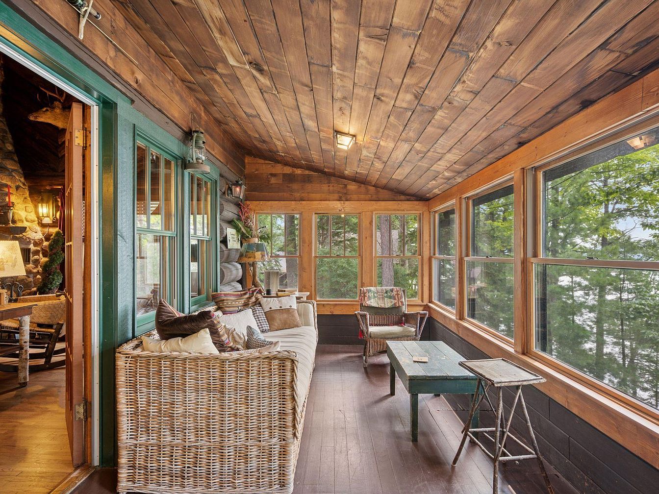 This sunroom features a rustic design with warm wood accents, showcasing a natural wood ceiling and rich brown walls. The room is lined with large windows, allowing ample natural light and views of lush greenery outside. A comfortable, white wicker sofa adorned with colorful throw pillows invites relaxation, while a vintage green table complements the casual decor. Additional seating includes charming wooden chairs, enhancing the inviting atmosphere. A subtle stone fireplace provides a focal point against the log wall, adding a cozy touch. Overall, the space embodies a serene, nature-inspired aesthetic ideal for unwinding.