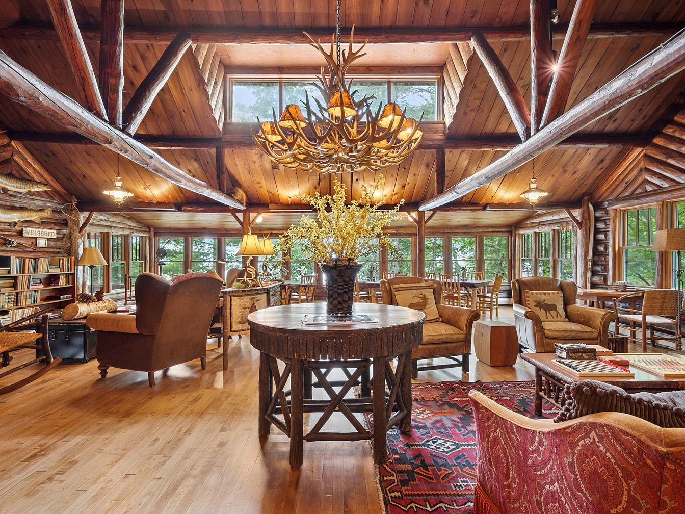 This spacious living room features a rustic charm with its exposed log beams and wood-paneled ceiling. The warm wood tones create a cozy atmosphere, complementing the hardwood flooring. A large round table made of thick timber serves as a focal point, surrounded by comfortable armchairs upholstered in earthy tones. Decorative throw pillows add a splash of color and texture. A grand chandelier with an antler design hangs from the ceiling, while multiple light sources, including table lamps, enhance the room’s warmth. Large windows offer a panoramic view of nature, filling the space with natural light.
