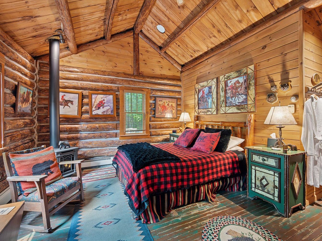 This rustic bedroom features log walls and a vaulted ceiling, creating a cozy, cabin-like ambiance. A plush, bold red and black plaid duvet covers the bed, accompanied by two decorative pillows. Opposite, a wooden rocking chair offers a nostalgic touch, adorned with a bear motif cushion. The room is softly illuminated by two bedside lamps on green and wooden nightstands, showcasing folk-art designs. Rich artwork depicting outdoor themes and horse riding adds vibrancy to the walls. A colorful area rug with tribal patterns grounds the space, while a black wood stove provides warmth, enhancing the inviting atmosphere.