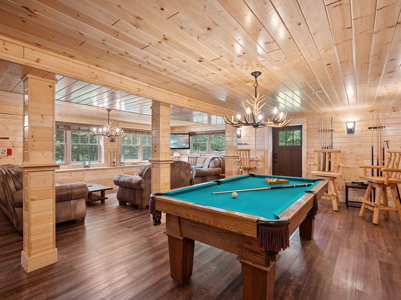 The game room features a spacious, inviting layout with natural wood elements dominating the aesthetic. The walls and ceiling are clad in warm, light-colored wood, enhancing the rustic charm. A classic wooden pool table with a teal felt surface sits centrally, inviting leisure activities. Surrounding it, plush brown leather sofas provide comfort, arranged for relaxation and socializing. A striking antler chandelier hangs overhead, adding a unique touch, while large windows offer ample natural light and views of the greenery outside. Corner tables and bar-style seating contribute to a casual, welcoming atmosphere perfect for entertainment.