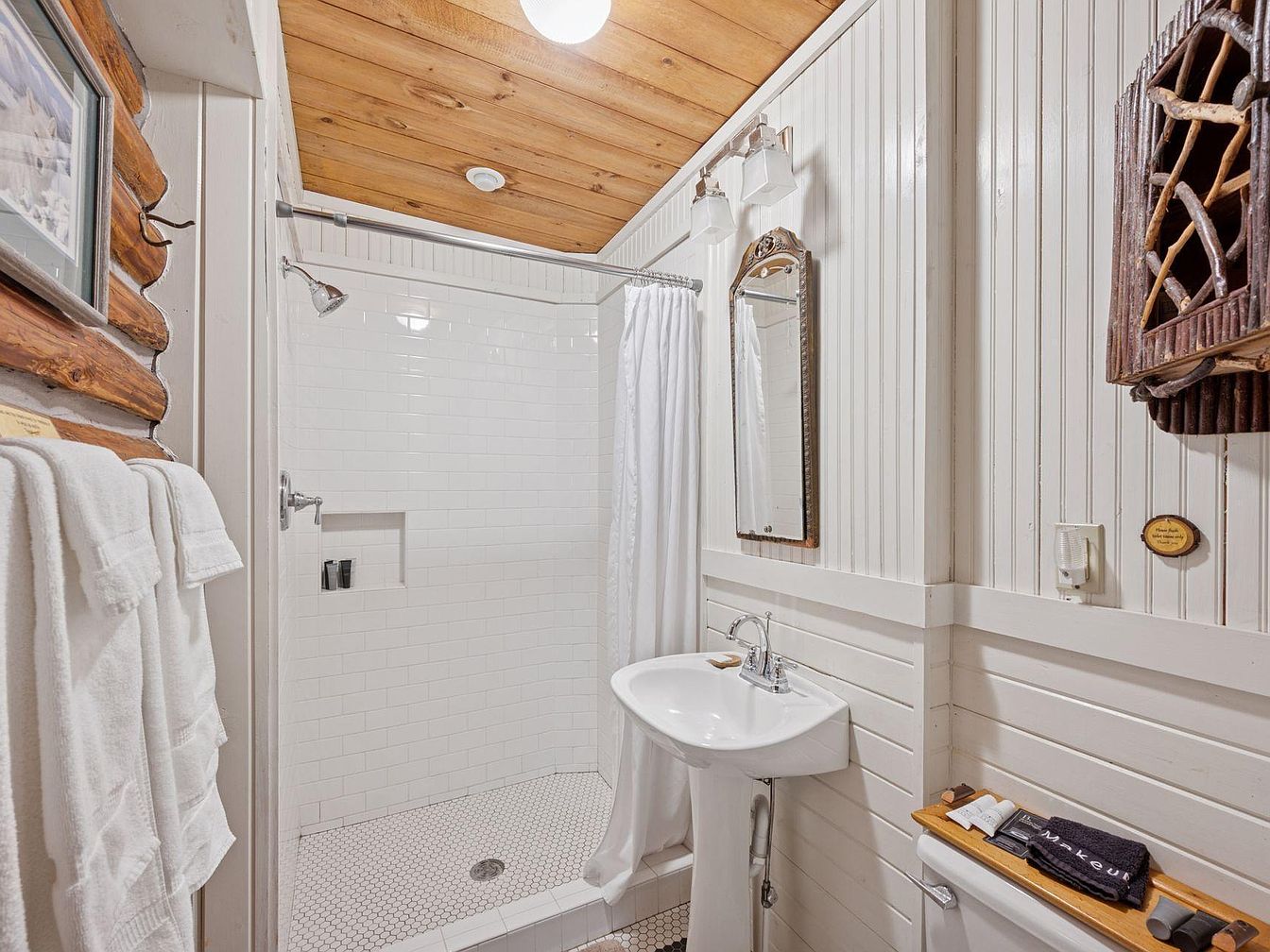 A cozy bathroom with a rustic charm features a shower area, accented by white subway tiles and a hexagonal tiled floor. The white shower curtain provides a soft contrast against the bright tiles. Nearby, a small pedestal sink stands elegantly beneath a decorative mirror framed in a natural wood style, adding warmth. Plush white towels hang neatly on a rod, enhancing the clean aesthetic. The ceiling showcases rich wooden panels, bringing organic texture to the space. Additional wooden decor and toiletries on the counter hint at careful organization, embodying a serene, inviting atmosphere perfect for relaxation.
