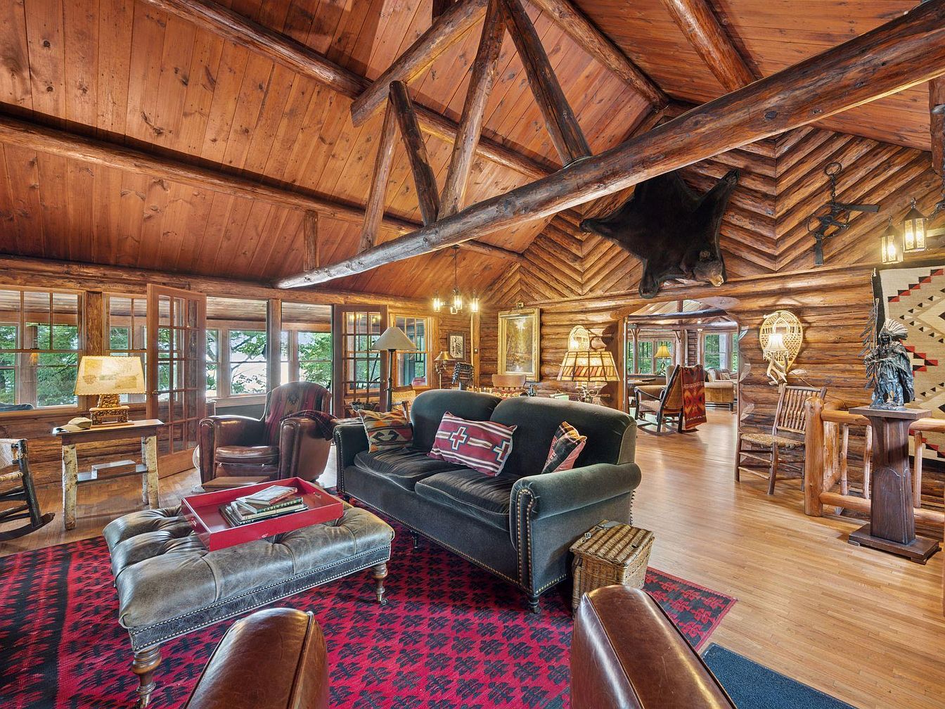 This rustic living room features a stunning wood-beamed ceiling and log cabin walls that evoke warmth and coziness. A rich color palette of deep greens and warm browns enhances the natural ambiance. The centerpiece is a plush dark green sofa adorned with vibrant red and patterned throw pillows, complemented by a tufted leather ottoman topped with a tray of books. Nearby, a pair of leather armchairs offer inviting seating. A traditional plaid patterned rug anchors the space, while large windows allow ample natural light, and wall-mounted artifacts add character to the charming, rustic decor.