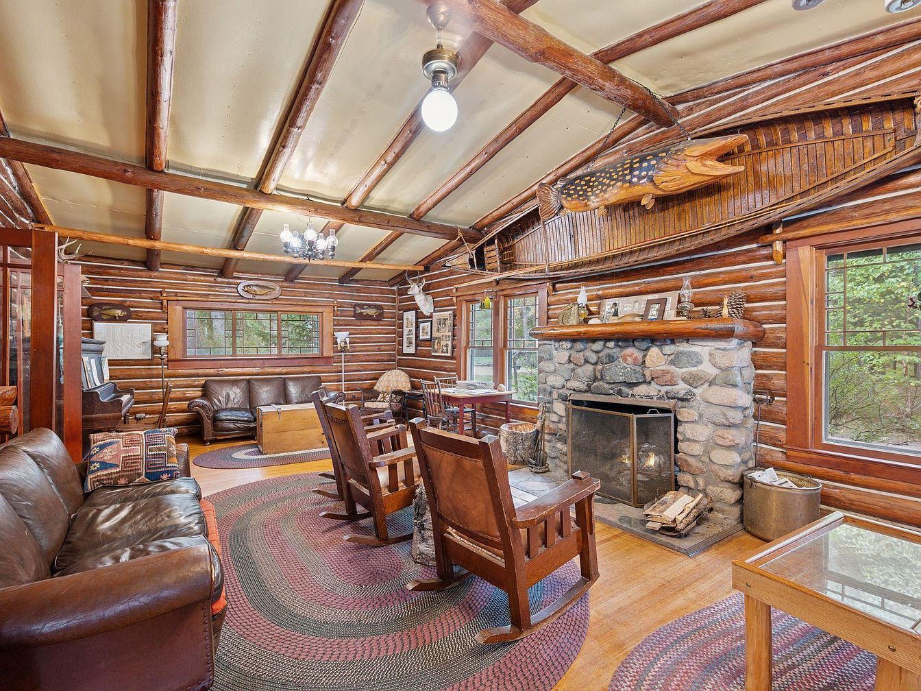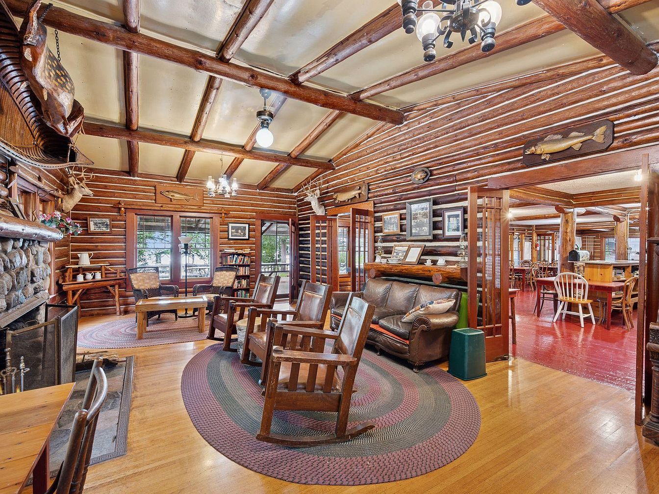 A cozy great room features a rustic log cabin aesthetic, highlighted by exposed wooden beams and stone fireplace. The walls are adorned with natural logs, and a vibrant hunter green and maroon braided rug anchors the seating area, which includes wooden rocking chairs and a plush brown leather sofa. Natural light floods through large windows, enhancing the warm wood tones. Antique decor such as fishing memorabilia and mounted trophies add character. In the background, wooden dining furniture complements the charm, while polished hardwood floors reflect the inviting atmosphere, creating an ideal gathering space that embraces nature.