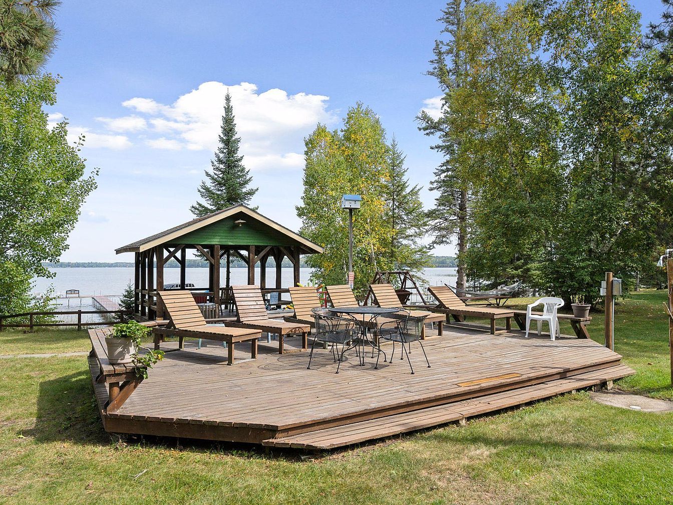 A spacious wooden deck extends toward the lake, showcasing a natural environment with lush green trees surrounding the area. Several lounge chairs with wooden slats are arranged for sunbathing, while a circular dining table with metal chairs invites gatherings. A shaded gazebo structure provides a focal point, highlighting a rustic charm with open sides for unobstructed views. The ground is mostly covered in grass, enhancing the outdoor feel, and a gentle slope leads down to the water’s edge. This serene setting combines relaxation and nature, perfect for enjoying leisure time near the lake.