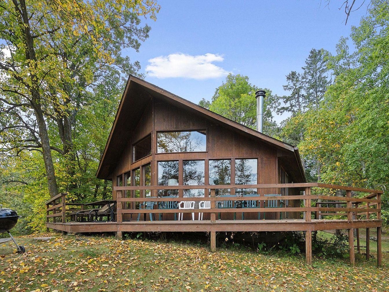 The outdoor patio features a wooden deck that extends from the house, providing a welcoming space for relaxation. The design showcases rustic wooden siding, evoking a cozy cabin feel. Various seating arrangements include sturdy, colorful plastic chairs alongside classic Adirondack styles, inviting leisure. A circular charcoal grill sits prominently, adding functionality for outdoor cooking. Surrounding the area, lush greenery and trees create a tranquil atmosphere, with some low shrubs framing the patio. The softly sloped roofline enhances the home’s charming profile, harmonizing with the picturesque natural backdrop, highlighting the serene connection of indoor and outdoor living.