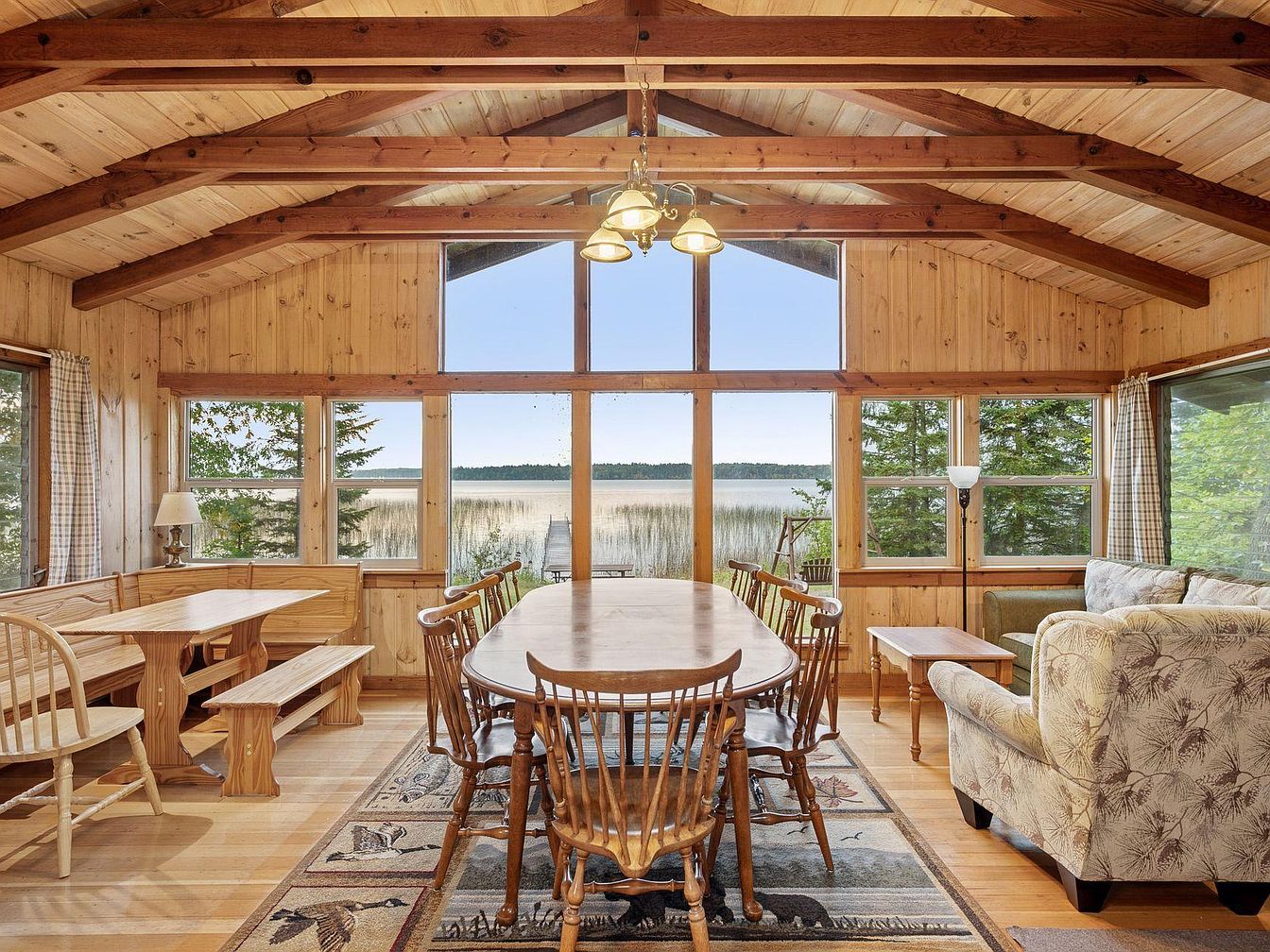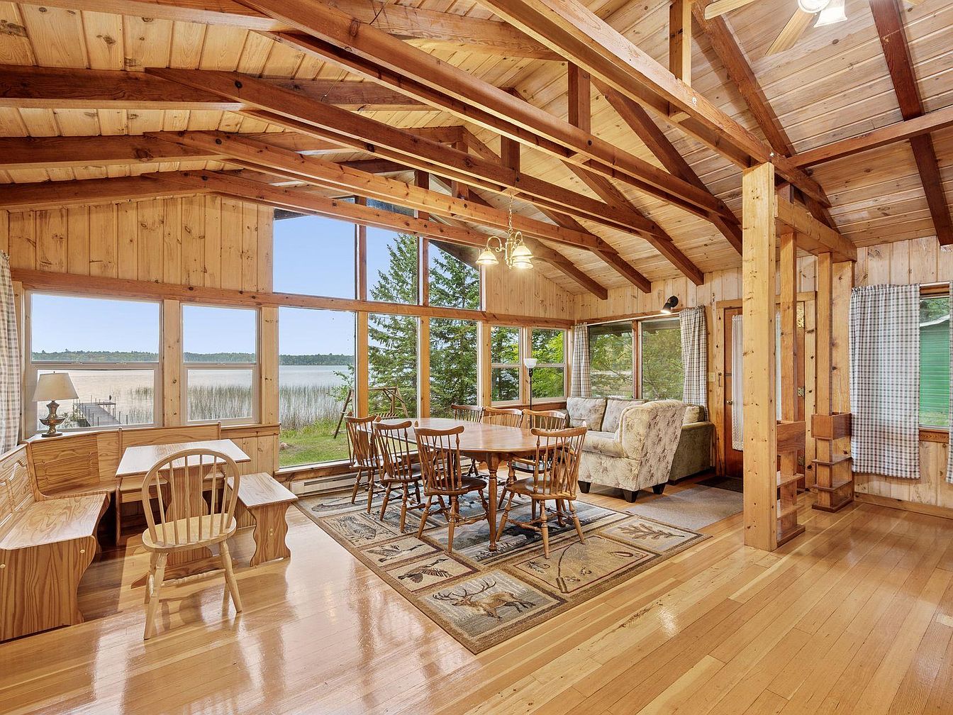 A spacious dining area with a rustic ambiance, featuring prominent wooden beams and paneling that emphasize natural materials. Large windows flood the space with natural light, offering stunning views of the lake and surrounding greenery. A round wooden table surrounded by six classic wooden chairs sits at the center, complementing a wooden bench along one wall. A cozy sofa in muted floral fabric adds comfort, while a subtle area rug with nature motifs ties the room together. Light-colored hardwood floors enhance the warmth, and the overall design reflects a blend of casual elegance and nature-inspired aesthetics.