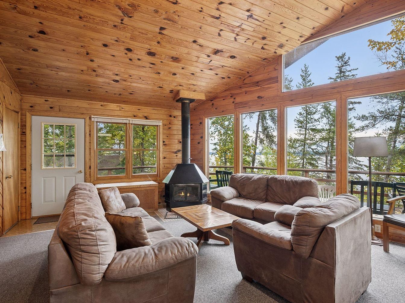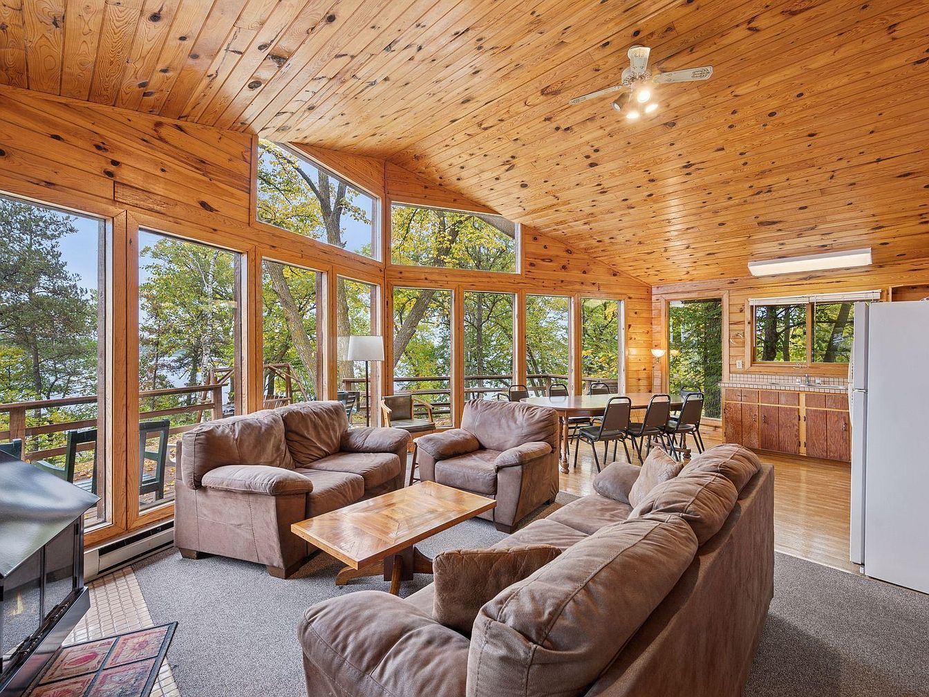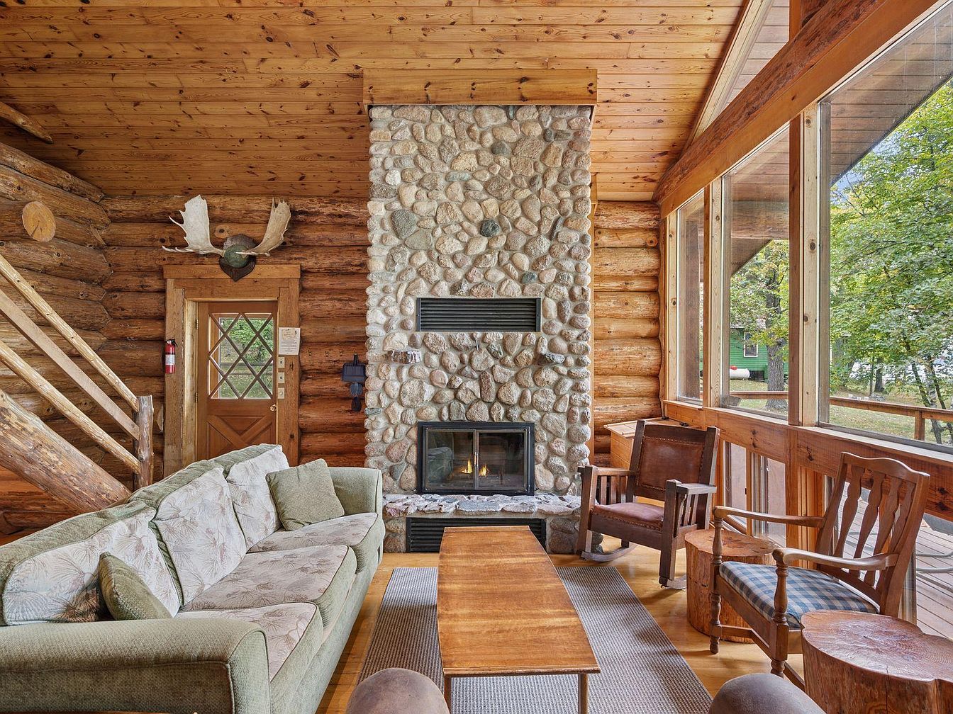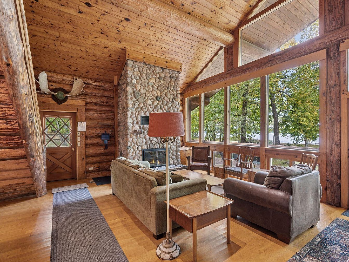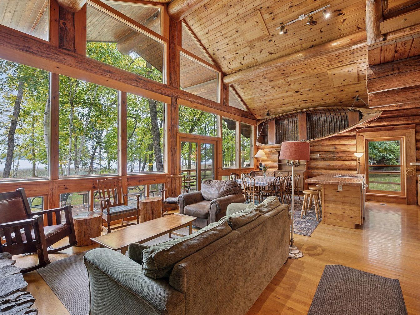 This spacious great room features a vaulted wooden ceiling with exposed beams, enhancing the rustic charm. Large floor-to-ceiling windows offer panoramic views of the surrounding greenery and lake, flooding the space with natural light. A stone fireplace creates a cozy focal point, complemented by a plush, olive-green sofa and a casual wooden coffee table. A patterned area rug adds color beneath a mix of chairs, including stylish wooden seating. A dining area is visible, furnished with a large table and bentwood chairs, inviting gatherings. Warm wood tones throughout create a harmonious, inviting atmosphere.