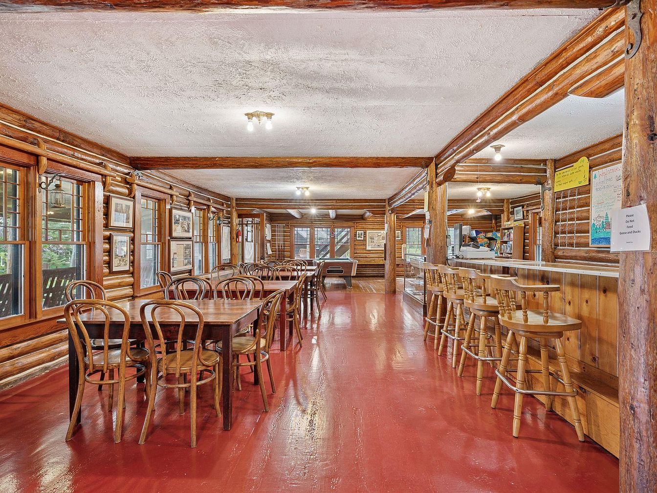 This spacious dining area features a rustic design with exposed wooden beams and log walls, emphasizing a cabin-like aesthetic. The flooring is a vibrant red, creating a warm and inviting atmosphere. Several round wooden tables and chairs occupy the space, arranged to foster a communal environment. Natural light floods in through large windows adorned with traditional wooden frames, enhancing the cozy feel. A bar area with simple wooden stools is visible, adding functionality to the room. Decor includes framed photographs, contributing to the historic character, while overhead lighting fixtures provide ambient illumination.