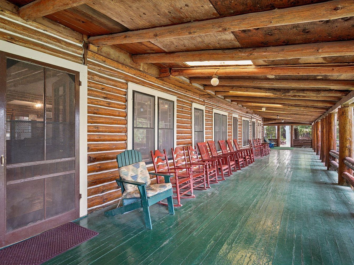 This expansive porch features sturdy, round wooden posts and a polished wooden ceiling. The floor boasts a vibrant green hue, creating a refreshing contrast with the natural wood. Several rustic rockers invite relaxation, while metal tables and chairs dot the space, perfect for outdoor dining. The surrounding landscape includes lush trees, providing a serene, natural backdrop. Soft lighting fixtures suspended from the ceiling enhance the cozy ambiance. Sunlight filters through the space, brightening the inviting area. Architectural details like the wooden railings and beams contribute to its charming, rustic aesthetic, making it an ideal gathering spot.