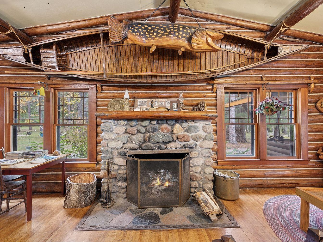 This cozy living room features warm wooden logs as wall elements, enhancing a rustic atmosphere. A prominent stone fireplace serves as a focal point, adorned with a classic iron grate and topped with decorative knick-knacks. Large windows allow natural light to flood the space, framed by rich wooden trim. A wooden table sits nearby, its surface cluttered with magazines and decorative items. The flooring showcases polished hardwood, contrasting with a braided rug underneath a simple wooden coffee table. An artistic canoe and a carved fish hang gracefully above, reinforcing a theme of nature and outdoor adventure.