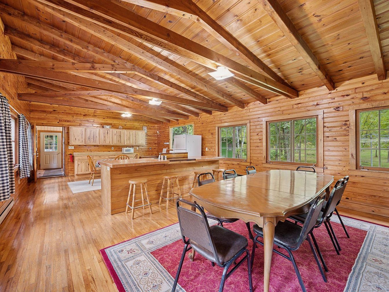 This spacious dining area features warm wooden walls and a vaulted ceiling with exposed beams, creating a cozy atmosphere. A large wooden table sits at the center, surrounded by black metal chairs, enhancing the rustic feel. Natural light pours in through multiple windows, allowing views of the surrounding greenery. The floor showcases polished hardwood, complemented by a decorative red and cream rug beneath the table. To one side, a modern kitchen layout integrates seamlessly, featuring light wood cabinetry and countertops. The combination of natural materials and thoughtful layout fosters a welcoming and functional space for gatherings.