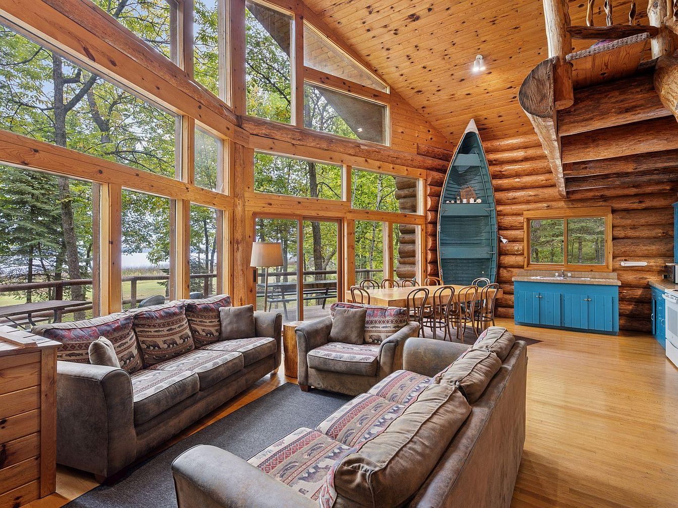 This spacious living room showcases a blend of rustic charm and modern comforts. The expansive windows invite natural light, framing lush greenery outside, with views of trees and water. A warm color palette features wooden beams, log walls, and honey-toned flooring, while plush seating in earthy tones, including a large sofa and leather chairs, promotes relaxation. A natural wooden coffee table complements tree stump side tables, enhancing the organic feel. Adjacent, a dining area with simple wooden chairs and a table provides a cozy gathering spot, while an artistic canoe suspended on the wall serves as a unique decorative element.
