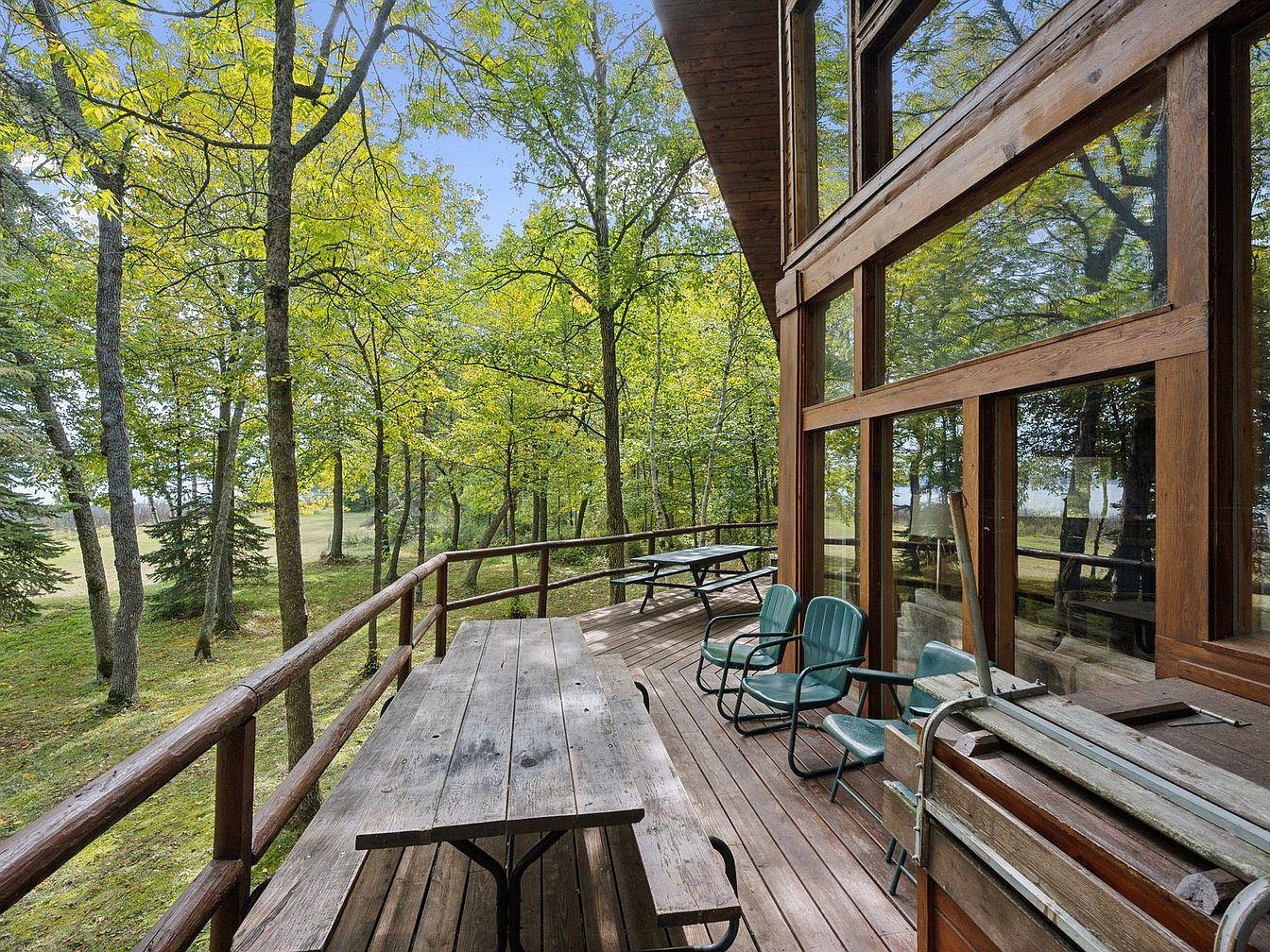 This outdoor deck area features a rustic wooden design, showcasing a large picnic table complemented by green plastic chairs. The surface is a warm, weathered wood, enhancing the natural aesthetic of the surrounding environment. Numerous trees in vibrant autumn hues provide a picturesque backdrop, creating a calming atmosphere. Large windows line one side of the deck, reflecting the lush greenery and inviting natural light. The structure’s angular roof and railings are crafted from heavy timber, emphasizing a sturdy and organic feel. This space is ideal for relaxation or social gatherings, seamlessly connecting indoor and outdoor living.