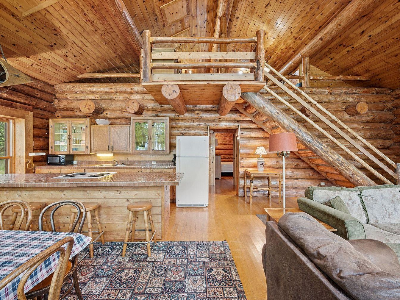 A rustic open living area features warm wooden tones from log walls and a high ceiling adorned with beams. A center island kitchen with a tiled countertop includes light wood cabinetry and essential appliances like a refrigerator. Nearby, a cozy seating arrangement with a brown leather sofa and a green fabric loveseat invites relaxation, while a patterned area rug adds texture. Natural light pours in through large windows, emphasizing the space’s inviting atmosphere. A staircase leads to a loft area above, and a small dining table with checkered tablecloth complements the informal yet stylish setting.