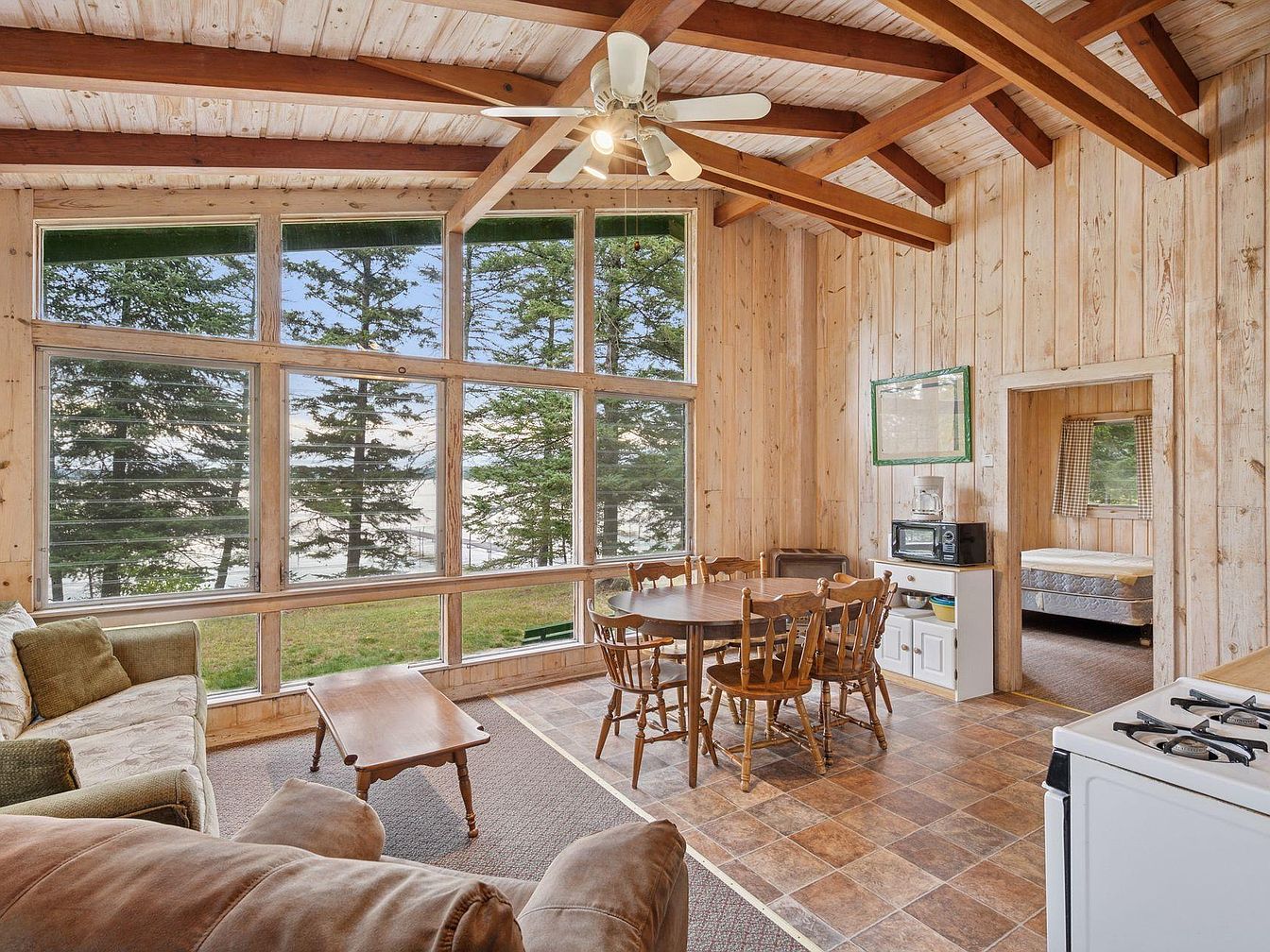 This sunroom features a rustic charm with wooden paneling and exposed beams. Large windows dominate one wall, allowing abundant natural light and offering views of trees outside. A cozy sofa in earthy tones complements a small coffee table, enhancing the inviting atmosphere. The dining area includes a round wooden table surrounded by classic wooden chairs, creating a perfect space for gatherings. The neutral color scheme, with wood and soft textiles, fosters warmth. An adjacent kitchenette holds essential appliances, while a doorway leads to a simple bedroom, maintaining the room’s cohesive and unpretentious design.