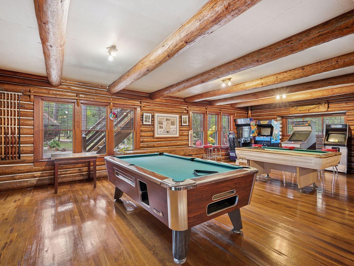 This spacious game room features warm wood tones throughout, with exposed log walls and beams that evoke a rustic charm. The hardwood flooring gleams under the soft lighting overhead. A classic pool table stands prominently in the center, flanked by a set of cues neatly arranged against the wall. To one side, a vintage arcade game corner adds a nostalgic feel, with colorful machines providing contrast to the earthy tones. Large windows invite natural light, framing views of the surrounding greenery. The overall atmosphere is welcoming and recreational, perfect for entertainment and relaxation.