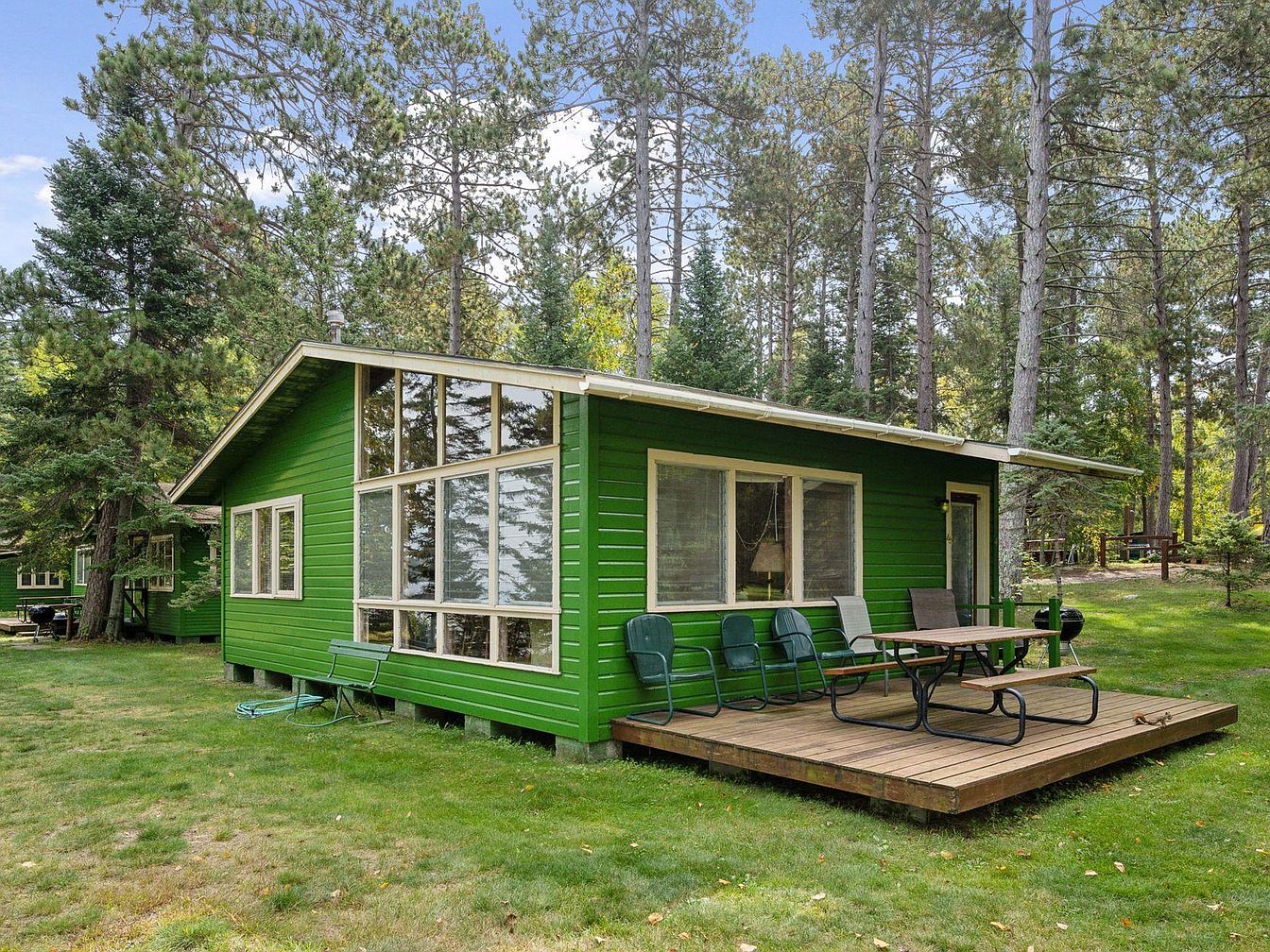 A vibrant green cabin nestled among tall pine trees, showcasing a modern yet rustic design. Large windows invite natural light and offer views of the serene surroundings. The front porch features a wooden deck equipped with simple outdoor furniture, including metal chairs and a picnic table, perfect for relaxing or dining outdoors. The sloped roof adds charm to the facade, complementing the cottage-like atmosphere. The lush lawn is well-kept, surrounded by greenery that enhances the natural connection. Architectural details include horizontal wood siding and carefully positioned windows that blend seamlessly with the landscape.