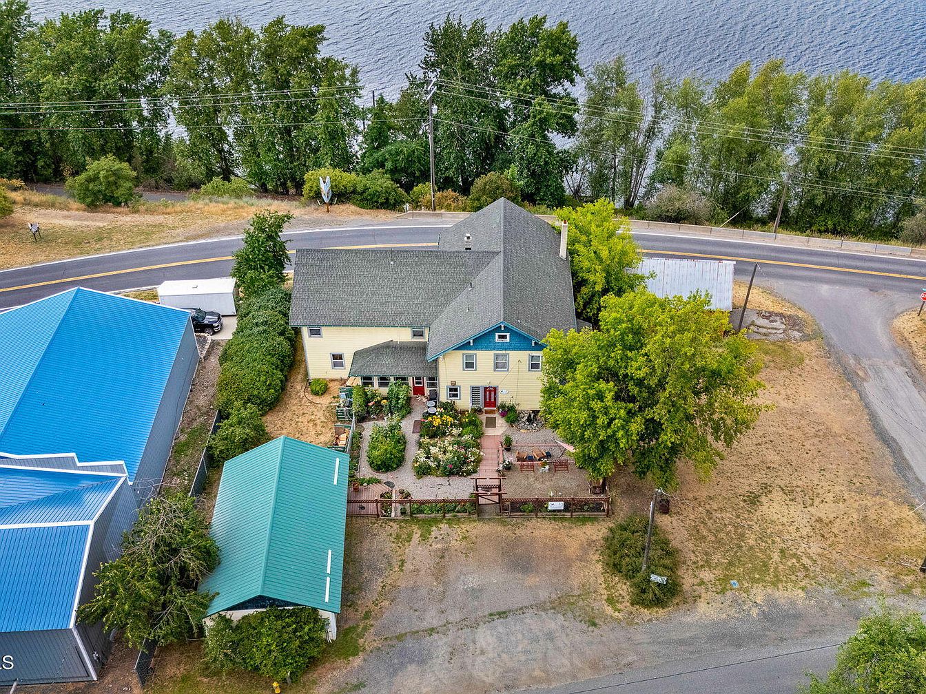 Aerial view of a historic American home with a central, welcoming garden area framed by lush bushes and flowering plants, surrounded by rustic fencing. The house is large, with cream-yellow siding and a green-shingled roof, accented by a teal-blue gable. Dual front doors sit beneath small awnings, opening onto a patio filled with potted plants, furniture, and decorative elements. The property features mature trees offering shade and privacy. Nearby, outbuildings with green and blue metal roofs add a practical, rural character. The house sits across from a river, separated by a two-lane road and lined with tall trees for a scenic backdrop.