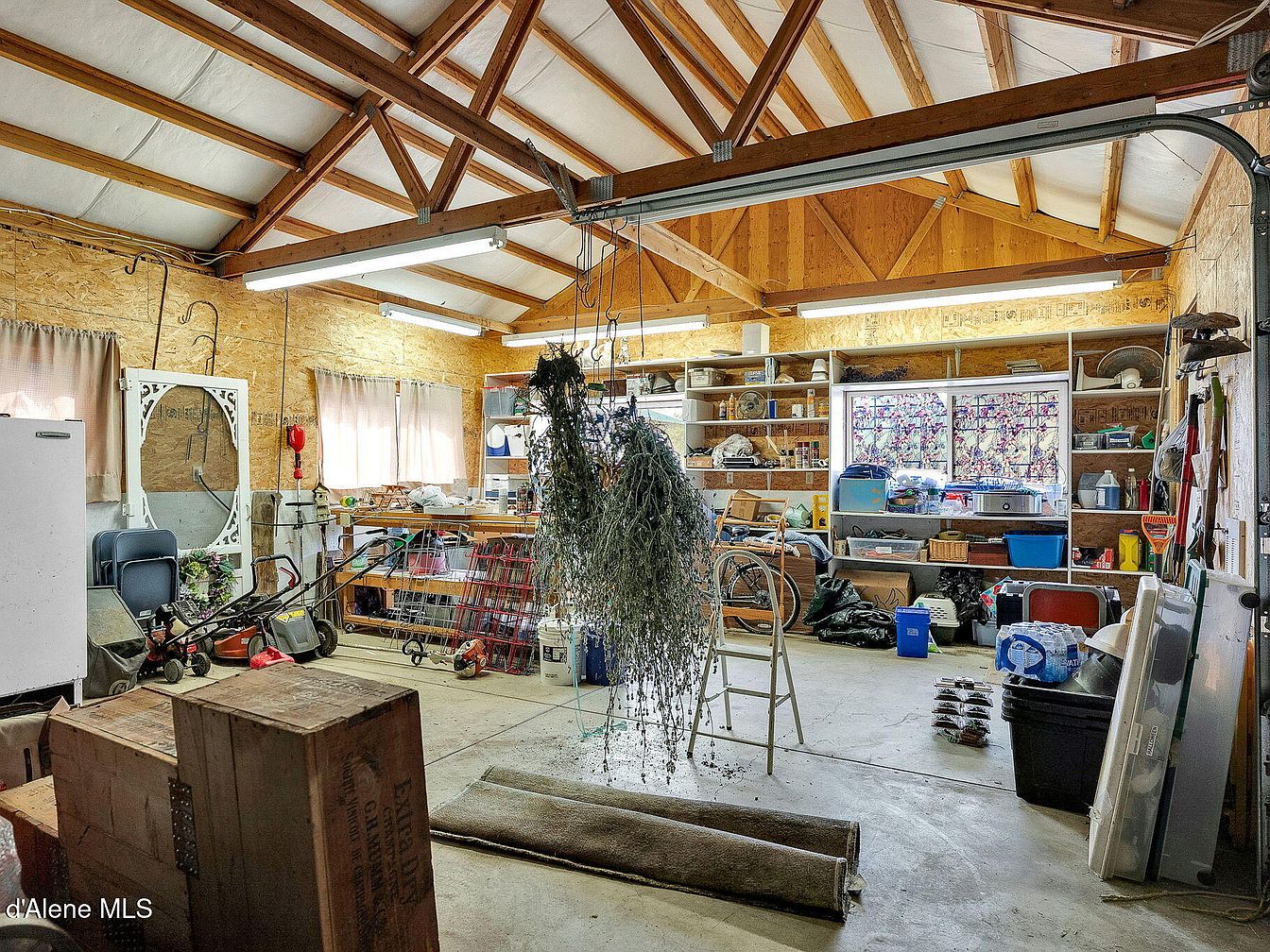 A spacious garage with exposed wooden beams supporting a vaulted ceiling and bright fluorescent lighting. The walls are made of unfinished wood paneling and display a variety of tools and supplies stored on open shelves along one wall. Multiple windows, dressed with curtains and floral-printed shades, let in natural light. The floor is concrete, cluttered with gardening tools, boxes, a lawnmower, and utility bins. A step ladder sits in the center, while bunches of dried plants hang from the ceiling. A white refrigerator, folding chairs, and an ornate screen door suggest multipurpose use, reflecting a practical, utilitarian aesthetic.