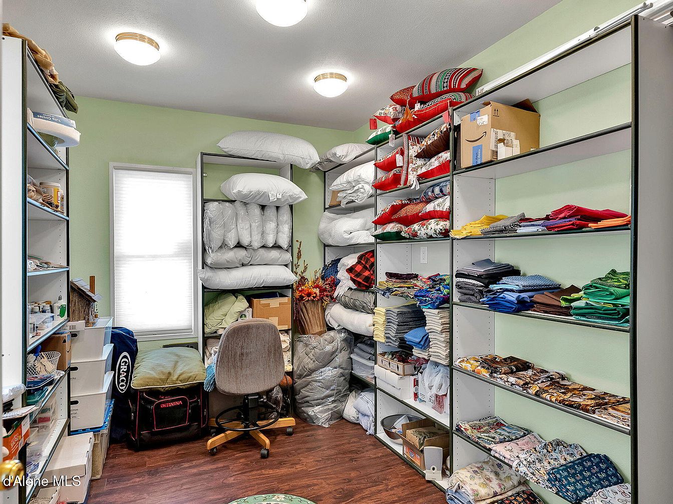A brightly lit room with soft green walls and dark wood flooring, featuring wall-mounted shelving units filled with neatly organized linens, pillows, and blankets. Stacks of folded fabric in a variety of colors, from bold reds and greens to serene blues and earth tones, are displayed on shelves along two walls. A window with a light-diffusing shade provides natural light, while ceiling-mounted round lights further illuminate the space. An office chair sits before a small table, surrounded by bins and boxes for additional storage. The overall effect is tidy, practical, and inviting, emphasizing organization and utility.