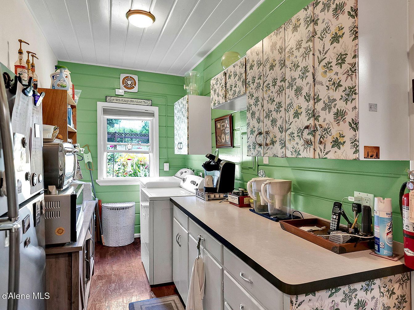 A charming, narrow kitchen with a cozy vintage feel. The room features green-painted wooden walls, adding a fresh and cheerful backdrop. The upper cabinets are adorned with floral-patterned coverings in soft pastel shades, bringing a whimsical, cottage-inspired look. Below the cabinets, the countertops are white with black trim, hosting appliances such as a coffee maker, toaster, and microwave, as well as kitchen essentials neatly organized in trays and bins. Natural light streams in from a window at the end of the room, highlighting a woven laundry hamper. The ceiling is white with narrow wooden planks and a single flush-mounted round light fixture.