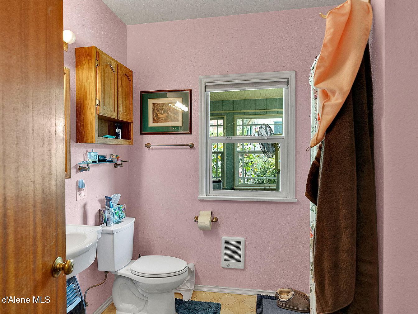 A small bathroom painted in soft pastel pink with a cozy and welcoming feel. To the left, a compact white sink sits beside a modern white toilet. Accessories like a blue tissue box and soap sit atop the toilet tank, while shelving above holds toiletries and glassware. Natural wood-finish cabinetry above the toilet adds warmth and traditional character. A medium-sized window admits natural light, overlooking lush greenery outside. A wooden towel rack and framed wall art offer visual interest. Chocolate brown and beige towels hang on the right wall, and a blue bath mat grounds the space, complementing the light yellow vinyl flooring.