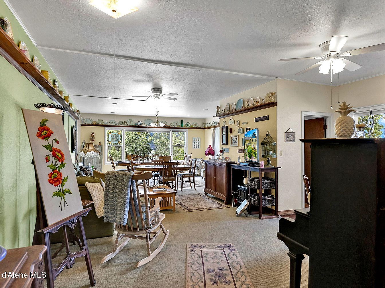 A spacious, open-plan living and dining area featuring soft green and cream walls with a cozy, vintage ambiance. Decorative plates line the perimeter shelf near the ceiling, adding a touch of character. A piano sits in the foreground with a pineapple ornament on top, while a light wooden rocking chair and crochet blanket invite relaxation. The main seating area offers a plush couch and armchairs, accompanied by a floor lamp. An easel with floral embroidery and multiple art pieces enhance the room’s traditional charm. Large windows along the back wall fill the space with natural light and views of greenery.