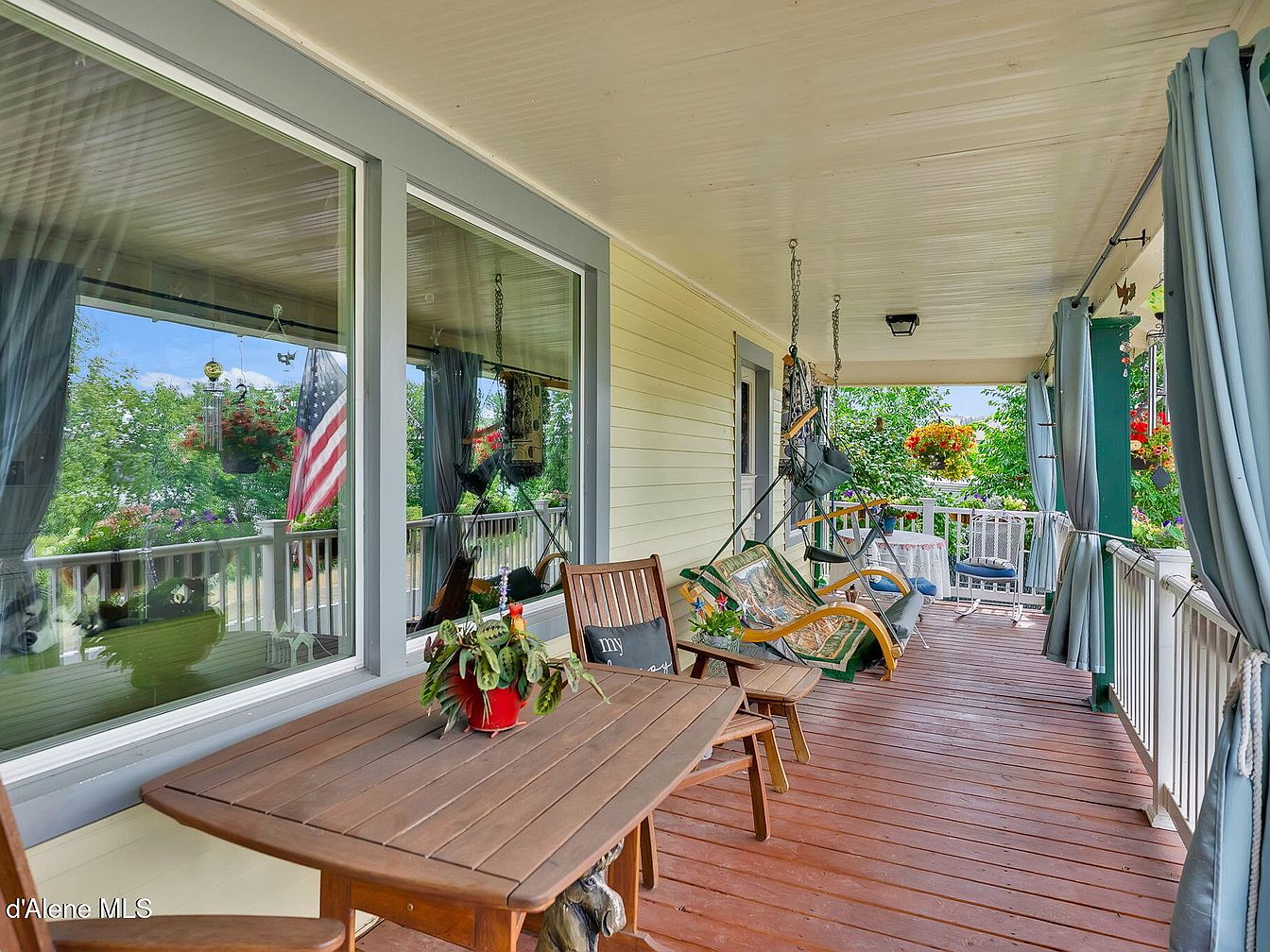 A spacious covered front porch features a warm redwood floor and creamy yellow siding, with several tall windows reflecting the garden. The space is furnished with a wooden dining set topped by a potted plant, as well as a cushioned wooden swing and a classic white rocking chair. Light blue curtains hang between green posts, creating a sense of privacy and elegance. Hanging baskets overflow with bright flowers, and the porch railing adds traditional charm. Decorative accents include an American flag and wind chimes, highlighting a cozy, welcoming atmosphere blending comfort with historic American details.