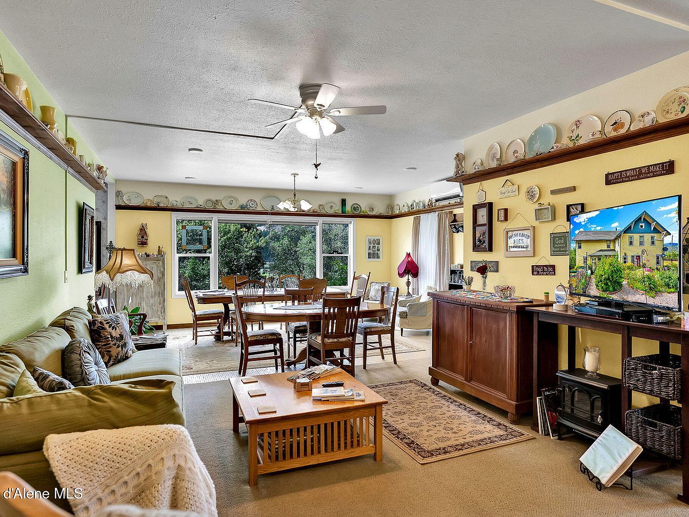 A spacious, open-plan room combines both living and dining areas, connected seamlessly by a soft beige carpet. Walls are painted in gentle yellow and light green tones, giving the space a cozy yet lively atmosphere. The dining area features a large wooden table with matching chairs, set near wide windows that fill the room with natural light and offer views of lush greenery outside. The living area contains a green upholstered couch, a wooden coffee table, and an ornate vintage lamp. Shelves display decorative plates and framed art, while a TV and eclectic wall decor add a welcoming, homey feel.