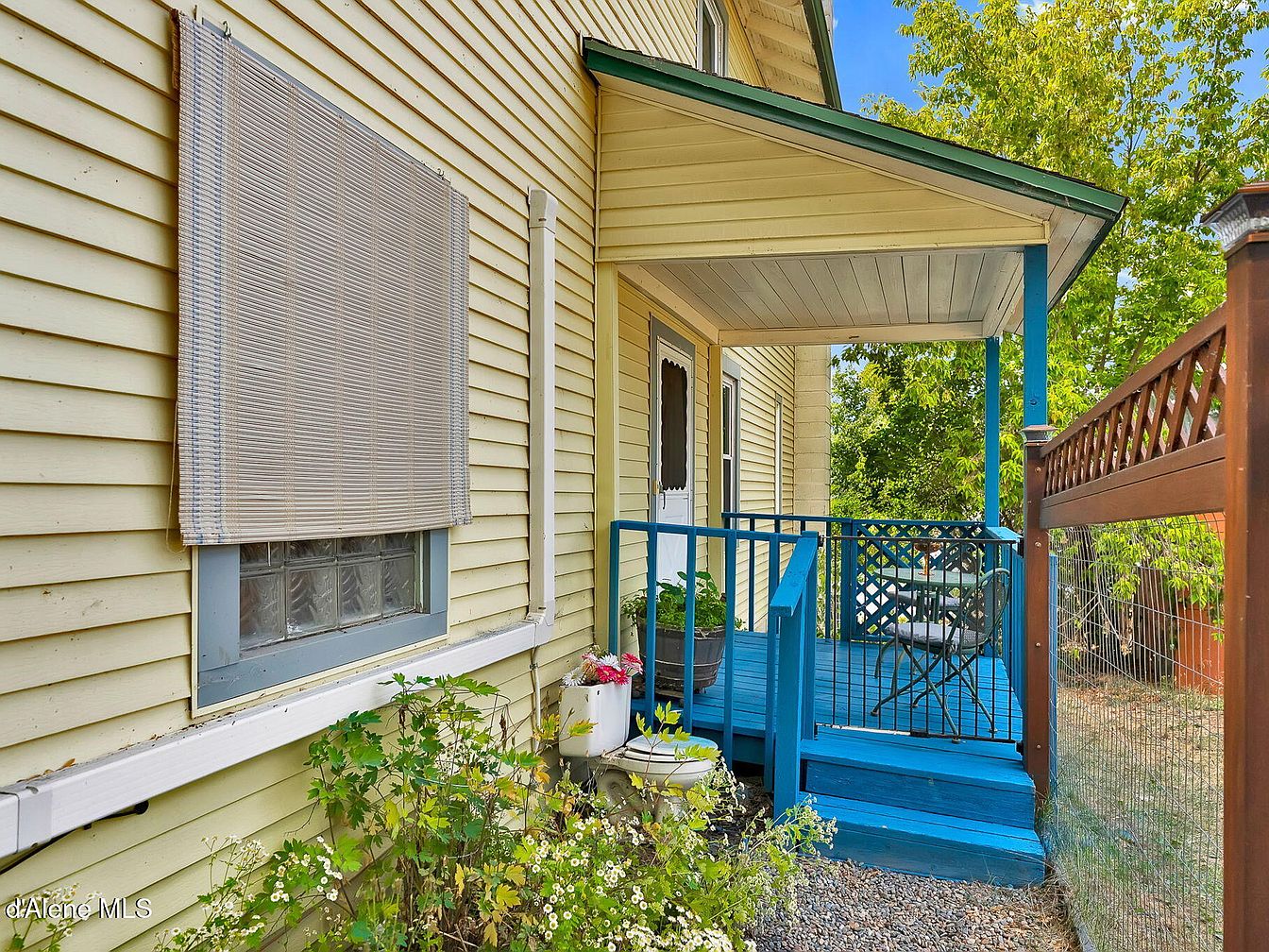 A small back porch features bold blue-painted wooden steps and railings that create a cheerful contrast against the light yellow horizontal siding of the house. A white door with a vintage scalloped window leads inside, framed by blue trim. To the left, a window is partly shaded by a rolled bamboo blind, while potted plants and small shrubs add greenery along the narrow garden bed at the porch’s base. A brown lattice-topped fence and wire mesh run alongside the porch, giving a sense of privacy and enclosure. Trees in the background offer additional shade and natural ambiance.