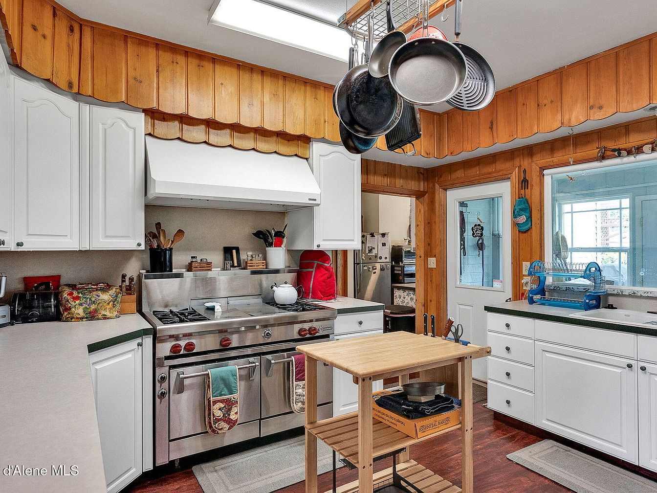 A cozy, lived-in kitchen features a mix of warm wood paneling and crisp white cabinetry. Upper cabinets and a large white range hood are flanked by scalloped wooden trim, lending a vintage, rustic charm. The stainless steel range is prominent, draped with colorful tea towels, and a white kettle sits atop the stove. A wooden rolling kitchen island stands at the center, providing workspace and open shelving. Above, a ceiling rack displays shiny pots and pans. The countertops host small appliances and decorative tins, while large windows and a back door welcome daylight, creating a warm, inviting space for cooking and gathering.