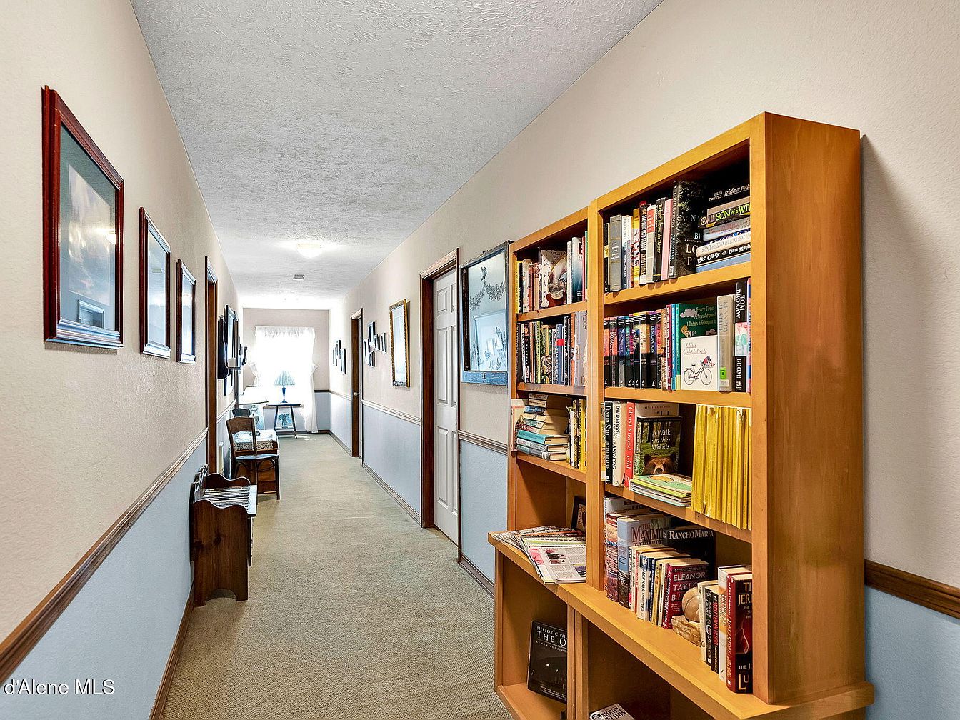A long, carpeted hallway featuring soft beige walls with a light blue lower wainscot and natural wood trim. On the right side stands a large, honey-toned wooden bookshelf filled with a varied collection of books and magazines. Framed art and photographs line the left wall, spaced evenly for a gallery-like feel. There are multiple doors leading to adjacent rooms on both sides of the hall, along with wooden accent furniture like a small bench and a table with a lamp at the far wall, which is illuminated by natural light through a sheer-curtained window, giving the space a cozy, inviting ambiance.