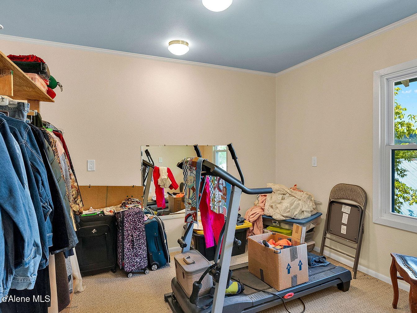 A compact room combines exercise and storage, featuring a treadmill placed in the center near a corner mirror that partially rests against the wall. The walls are painted a soft cream color, with a pale blue ceiling and white crown molding. A clothes rack filled with a mix of jackets and garments occupies one side, next to stacked suitcases and storage bins. A cardboard box and folded chair add to the lived-in, utilitarian feel. Natural light enters through a single window, providing a glimpse of greenery outside. The carpeted floor and basic ceiling fixtures keep the space practical and straightforward.
