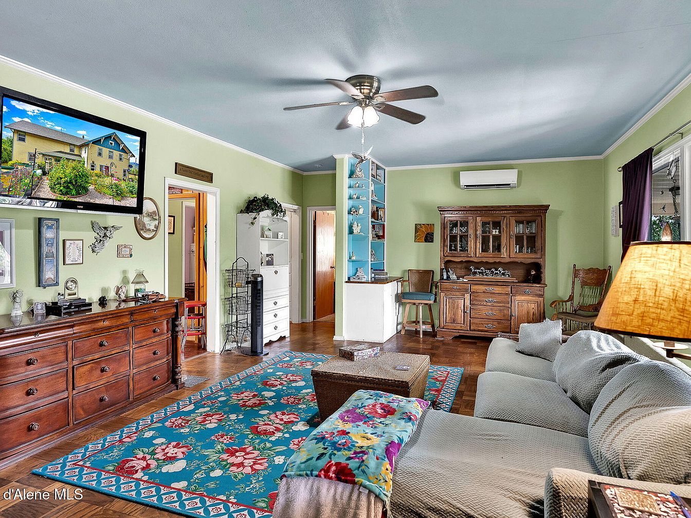 A spacious living room features pistachio green walls and a pale blue ceiling with white crown molding. Flooring is warm-toned wood, partly covered by a vibrant blue floral area rug that brings energy to the space. Large, overstuffed gray sofas are accented with colorful throws. A rustic wooden hutch, matching sideboard, and dresser add historic charm, while a mounted TV and modern mini-split cooling blend past and present. A cozy reading corner holds an old-fashioned rocking chair, and ceramic collectibles line open shelving painted a cheerful turquoise. Wide windows framed by deep purple curtains allow soft daylight to fill the room.